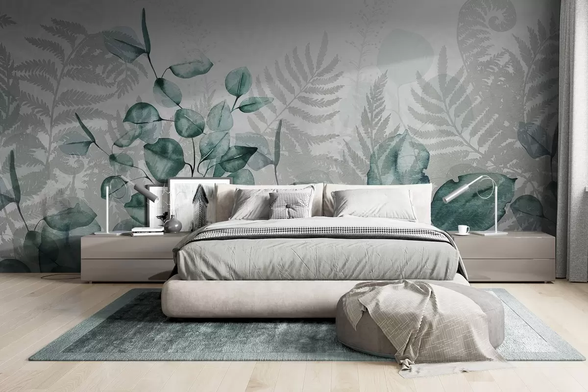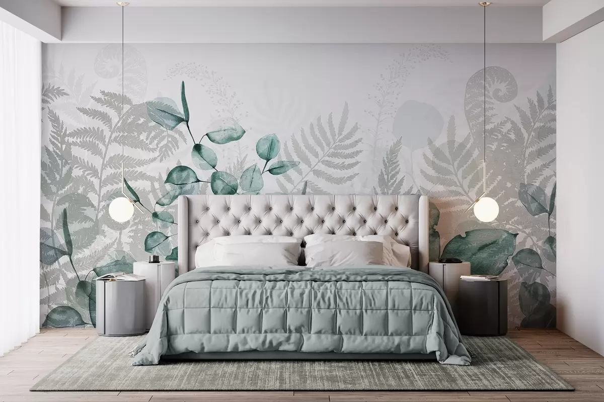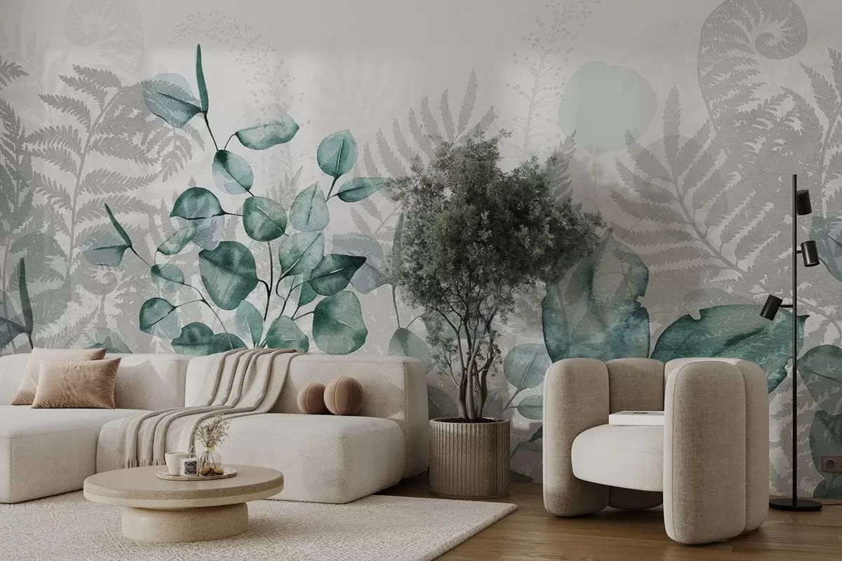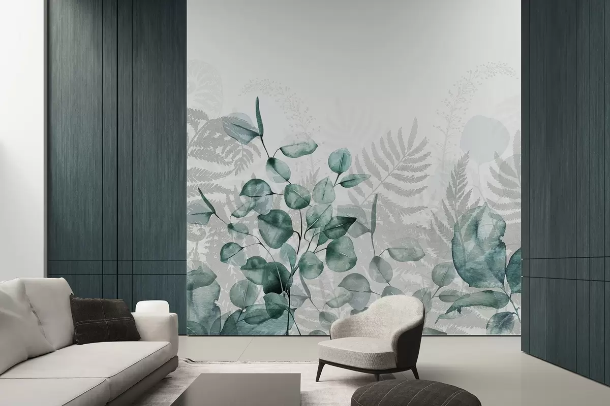 Zidne murale Listovi eukaliptusa i paprati u nijansama zelene i sive, efekt akvarela, botanička ilustracija br. w09197