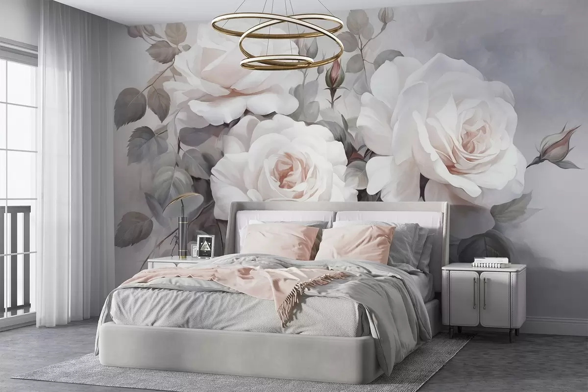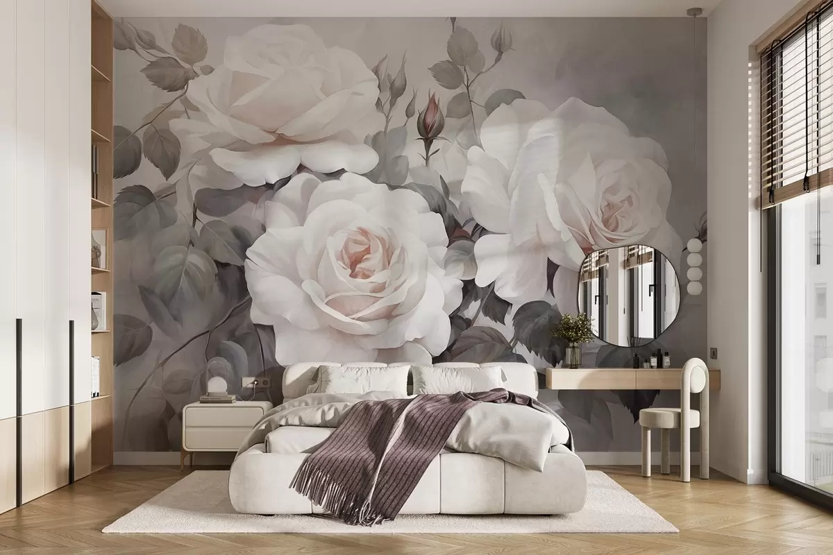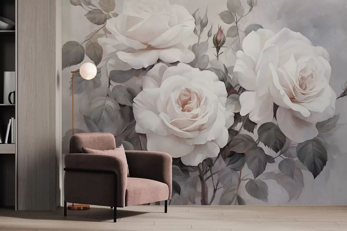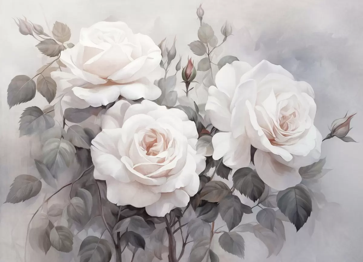 Zidne murale Teksturirane bijele ruže s listovima i stabljikama, meke prigušene pastelne boje, elegantan vintage stil, nježni potezi kistom br. w09198