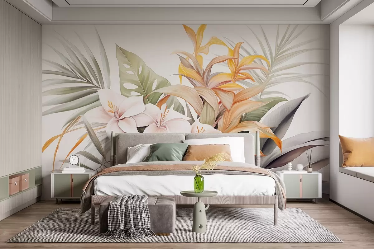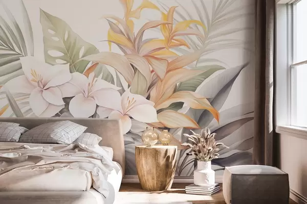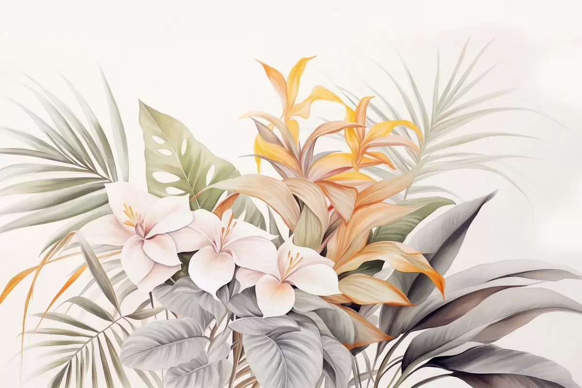 Zidne murale Botanička ilustracija tropskog cvijeća s listovima palme i monstere, meke boje, akvarelni stil br. w09201