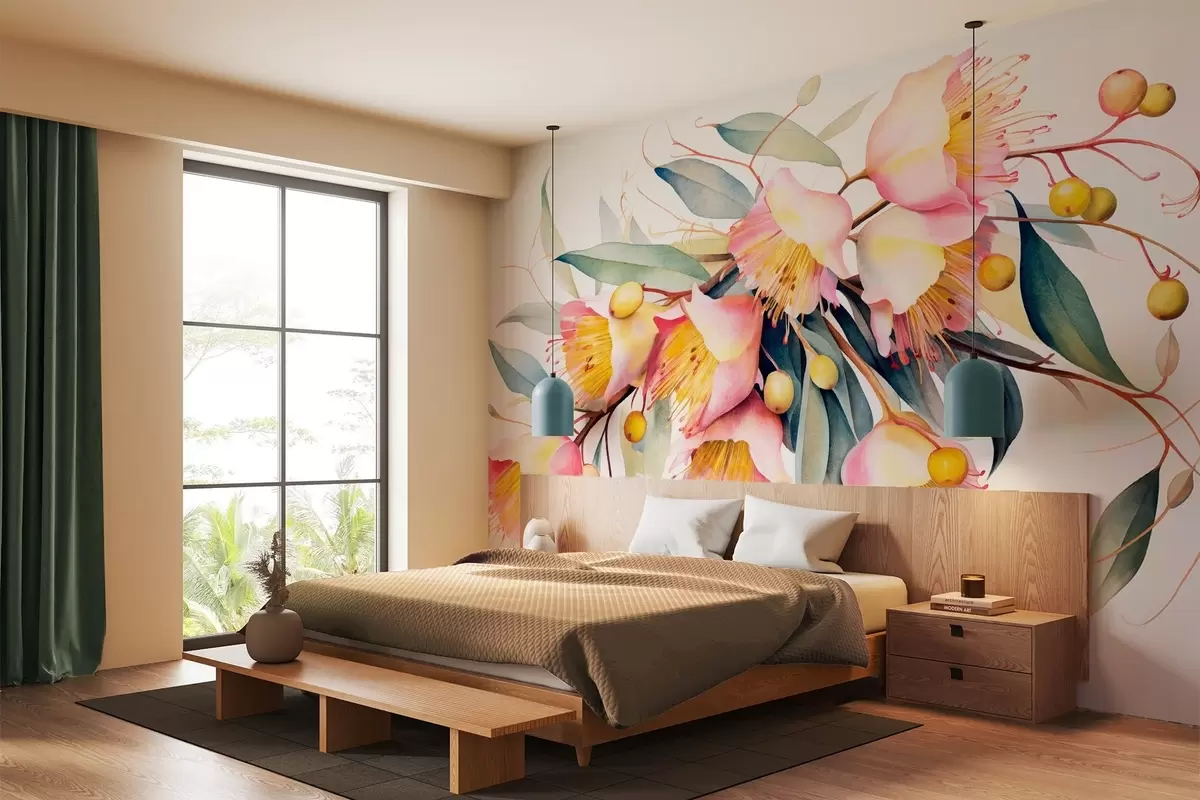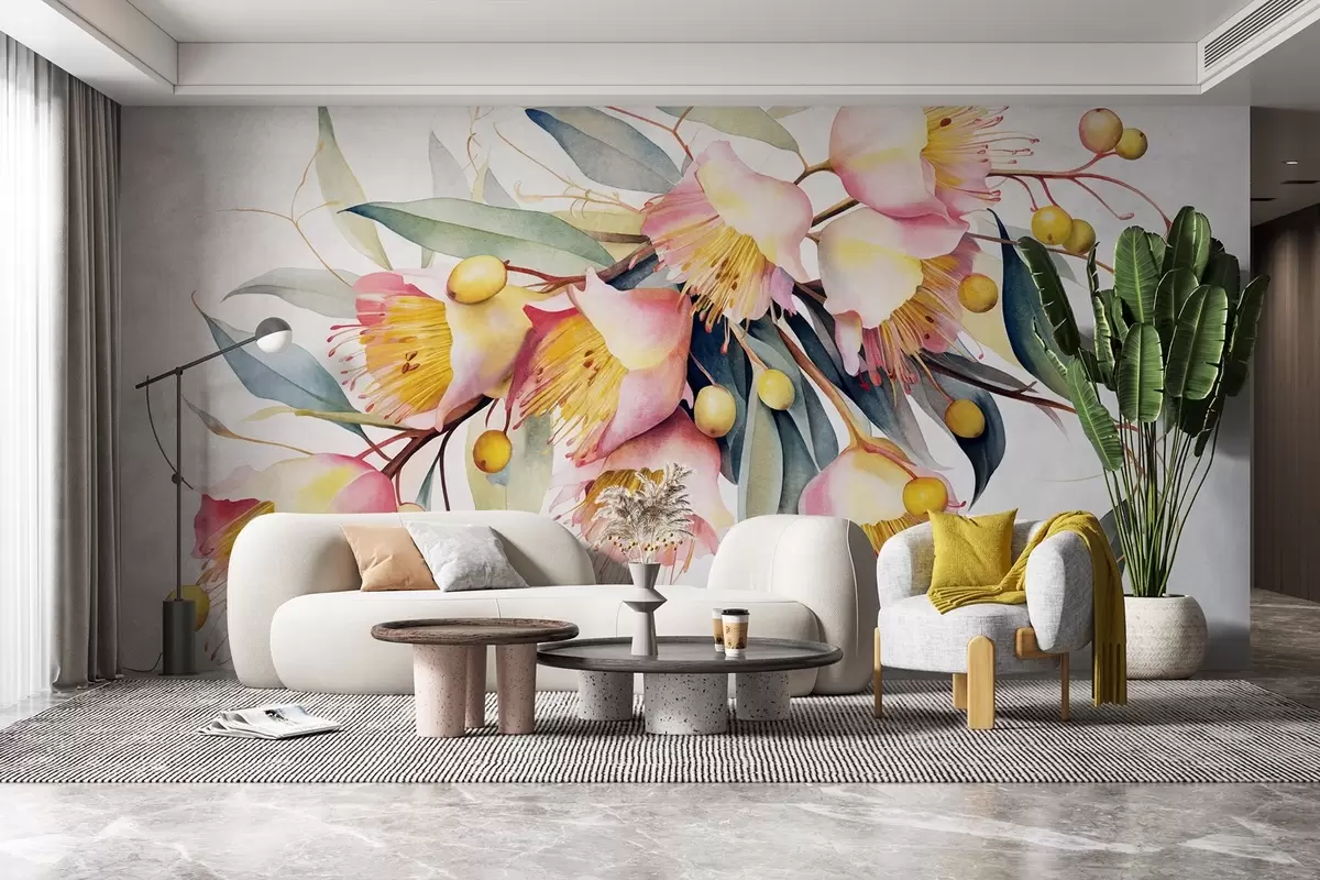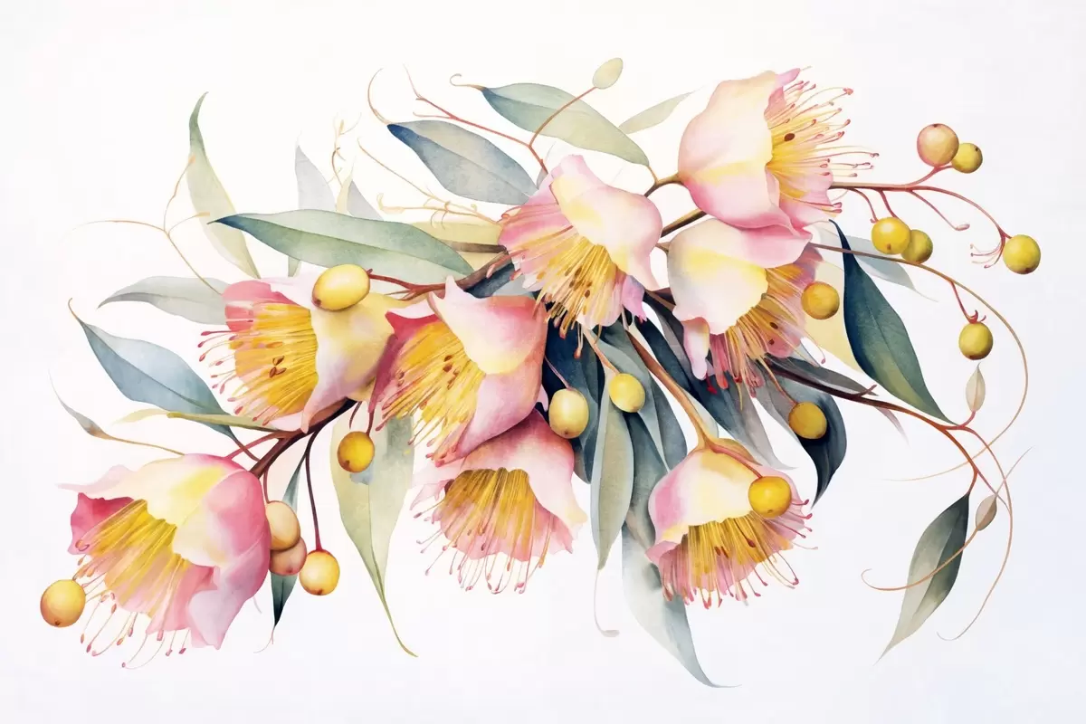 Zidne murale Cvjetovi eukaliptusa sa zelenim lišćem, akvarelni stil, mekani i teksturirani, svijetla pozadina, botanički cvjetni dizajn br. w09202