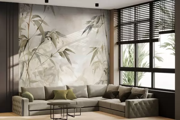 Zidne murale Granice teksturirane od bambusa s lišćem u akvarelnom stilu, meka neutralna paleta boja, svijetlo bež pozadina br. w09204
