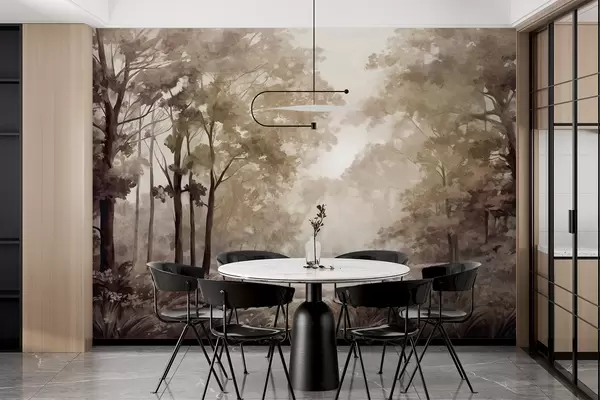 zidne murale Teksturirani šumski krajolik, drveće s bež i smeđim lišćem, pastelna paleta boja w09210