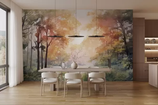 Zidne murale Teksturirani šumski krajolik, drveće s narančastim i zelenim lišćem, pastelna paleta boja br. w09210v1