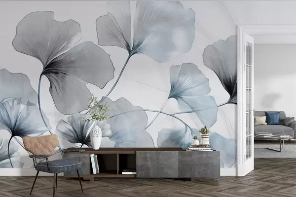 Zidne murale Listovi ginka bilobe u prigušenim plavim i sivim tonovima, nježni teksturirani efekt akvarela, svijetla pozadina br. w09215v1