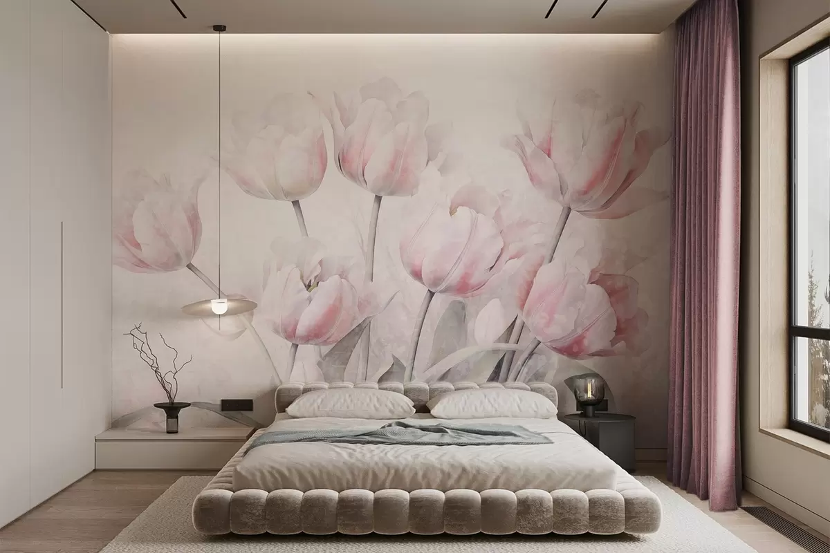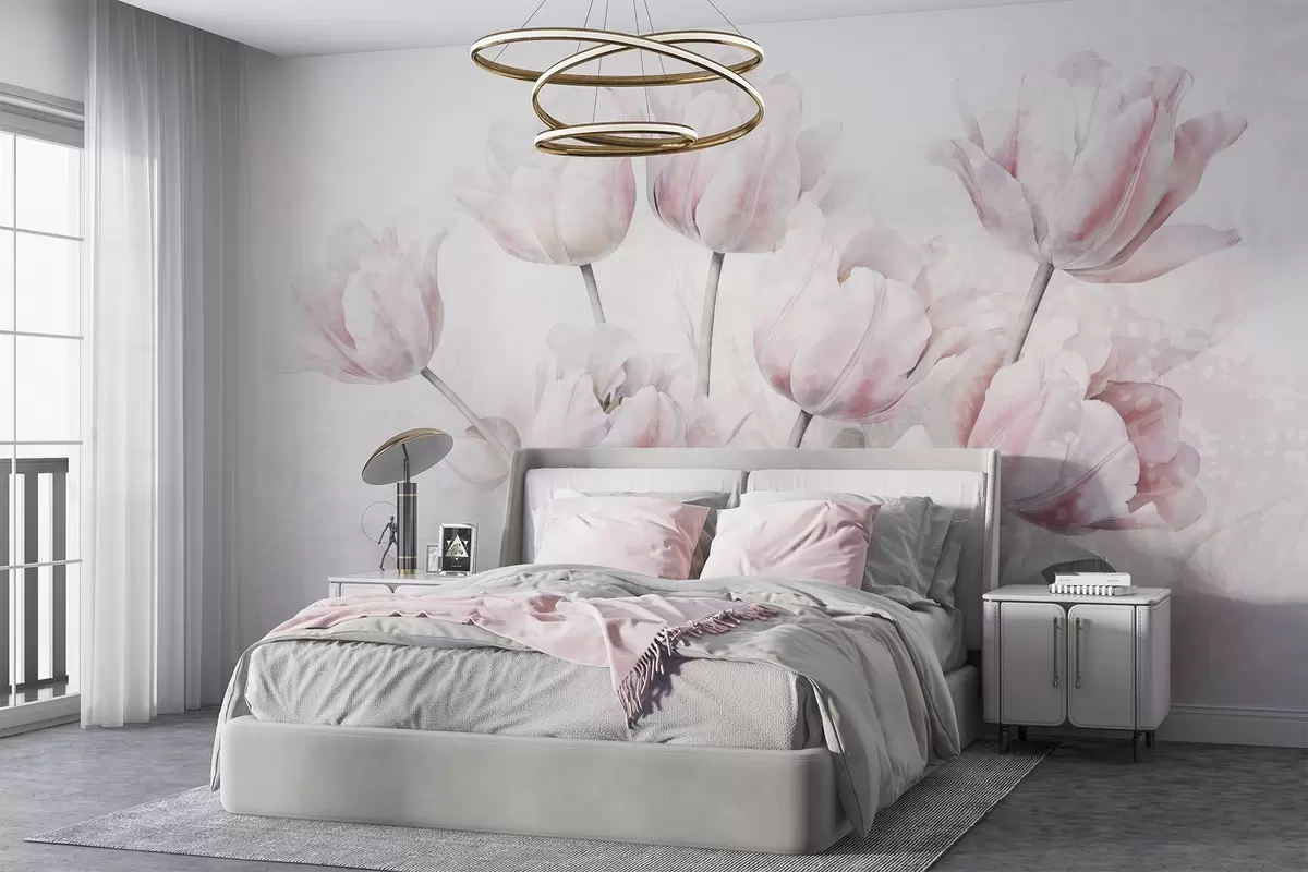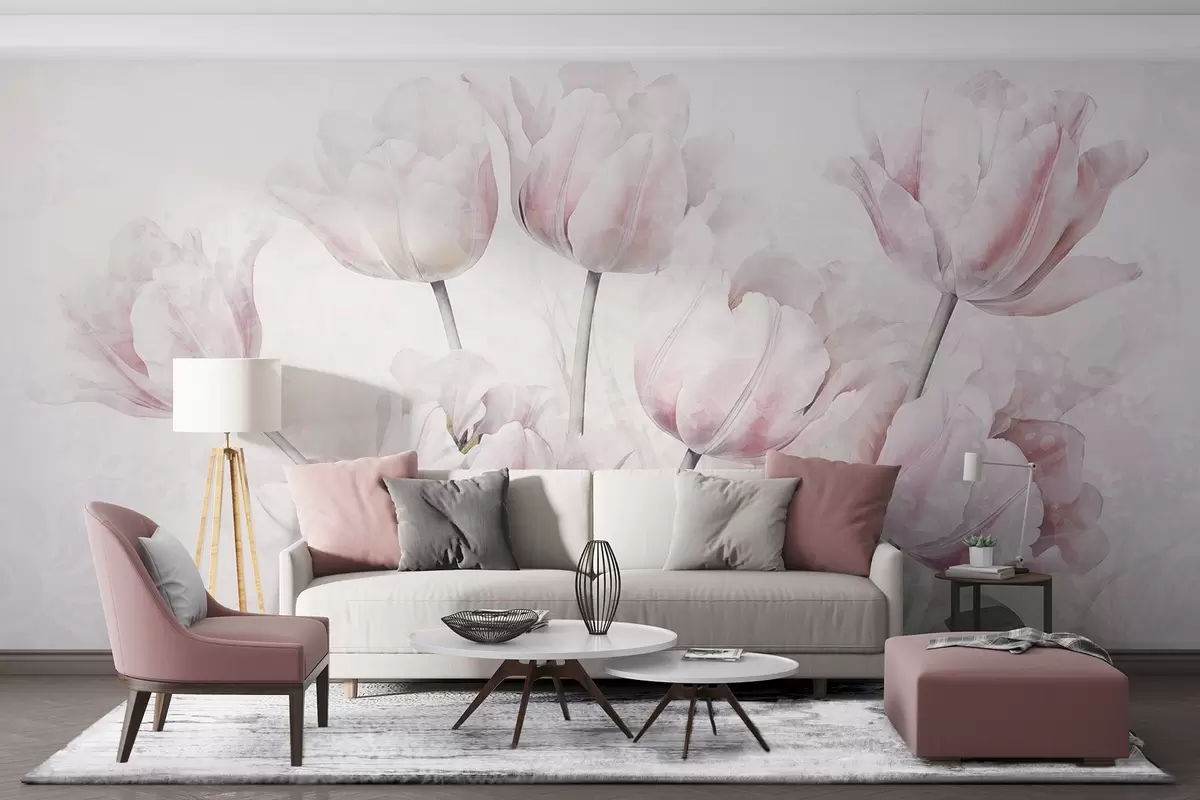 Zidne murale Ružičasti teksturirani tulipani sa zelenim lišćem, meko svjetlo, vintage stil akvarela, nježni potezi kistom br. w09220