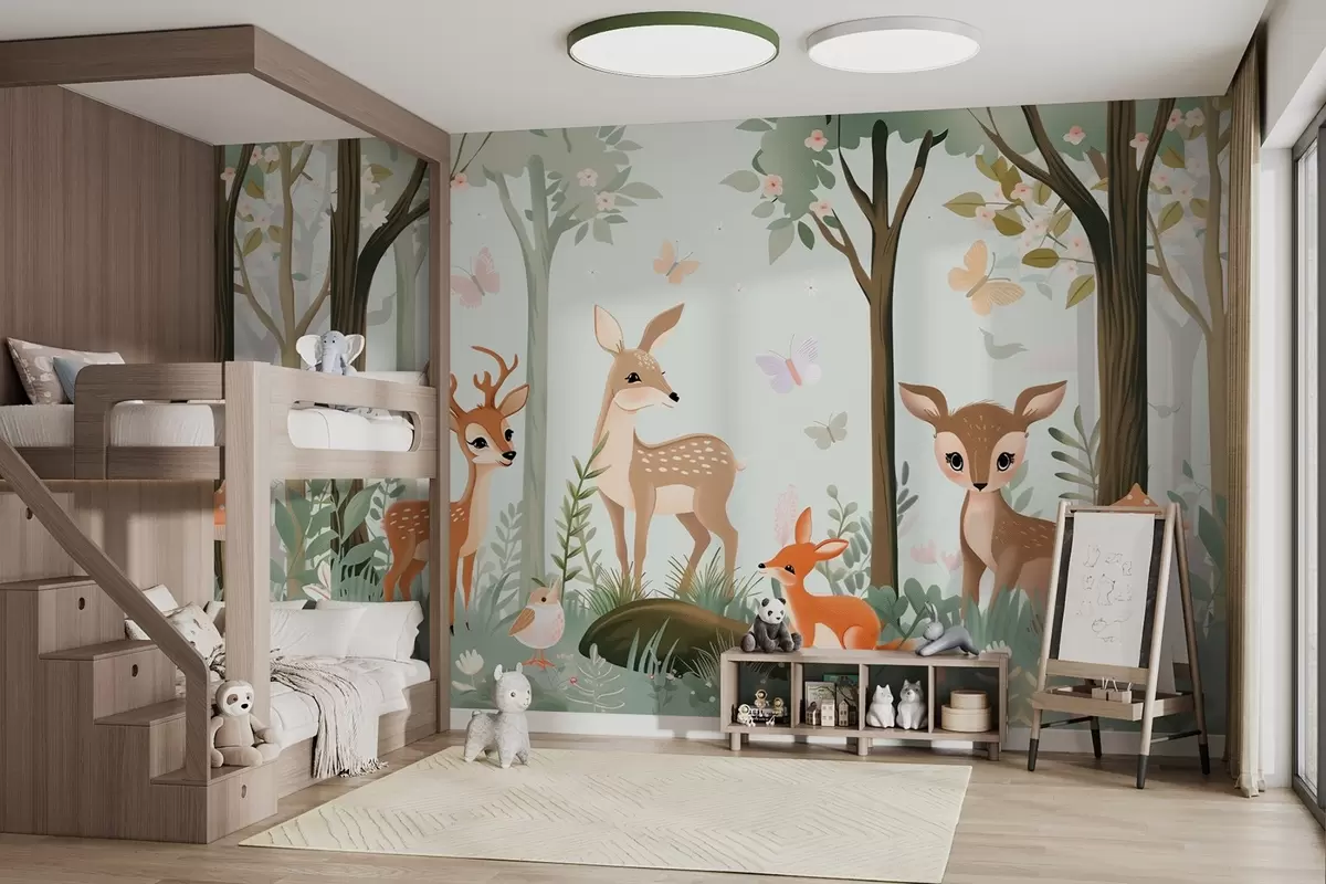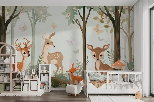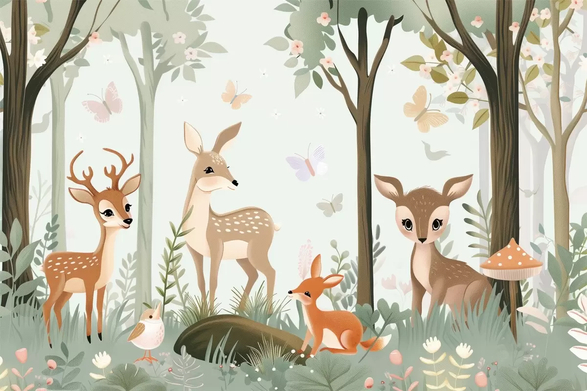 Zidne murale Hirovite šumske životinje u zelenim tonovima br. w09227