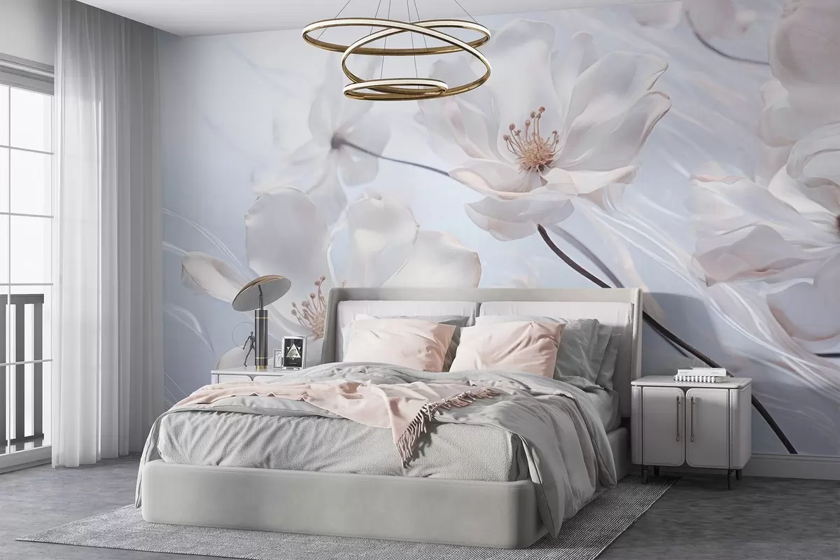 Zidne murale Bijelo teksturirano prozirno cvijeće s nježnim laticama, meka svijetloplava pozadina, elegantno, romantično, sanjivo br. w09233