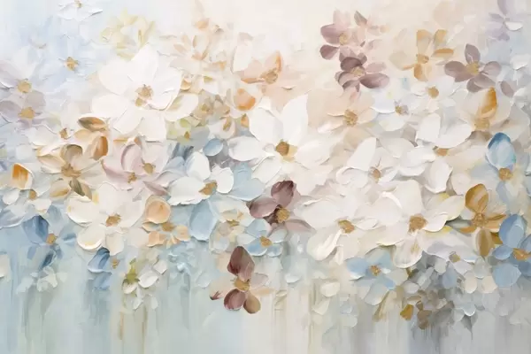 Zidne murale Uljana slika imitacije cvjetnjaka s bijelim, plavim i narančastim cvijećem, mekim potezima kista, pastelnim prigušenim bojama br. w09236v1