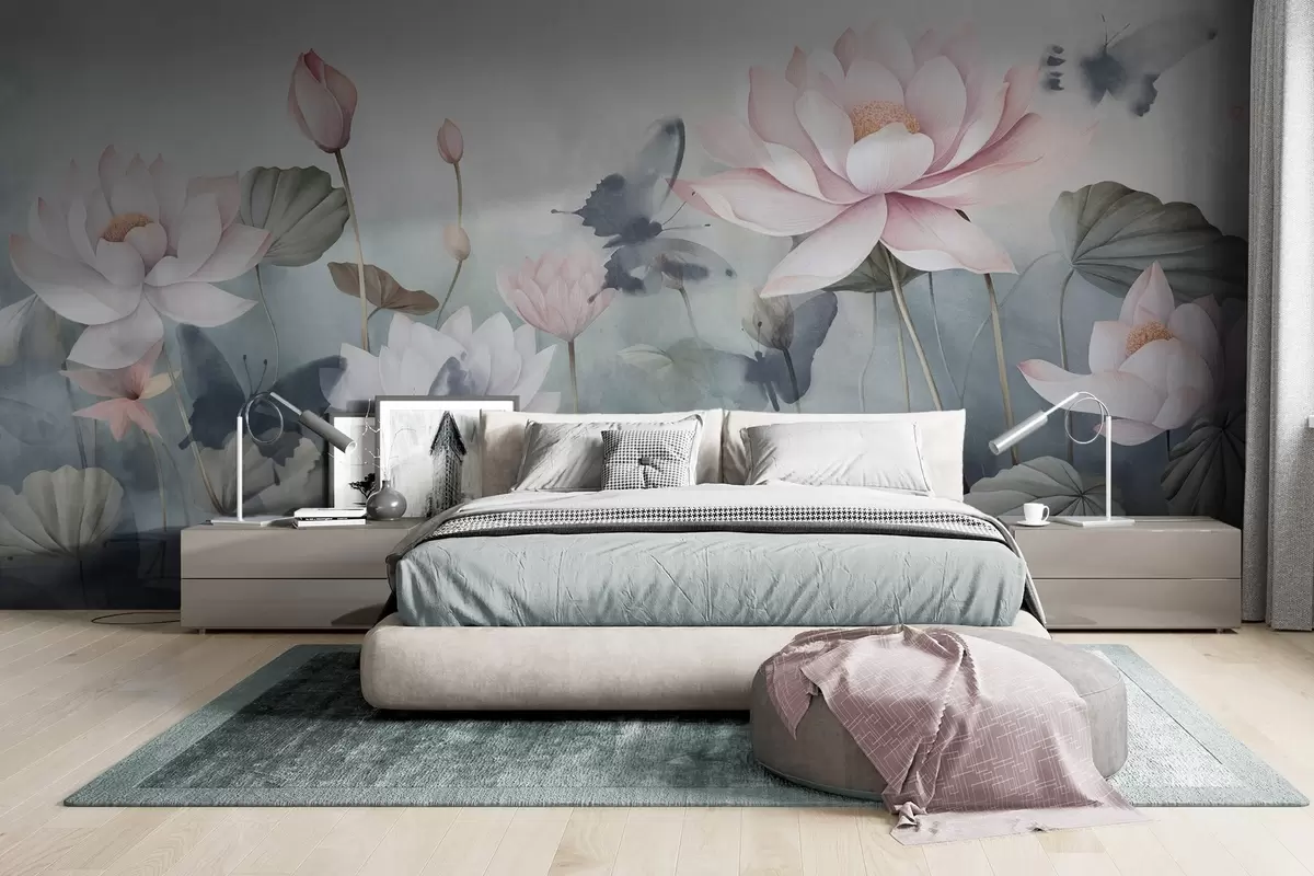 Zidne murale Cvijeće teksturirano lotosom s ružičastim pastelnim laticama, zelenim lišćem, odrazom vode, mekim pastelnim bojama, efektom akvarela br. w09254