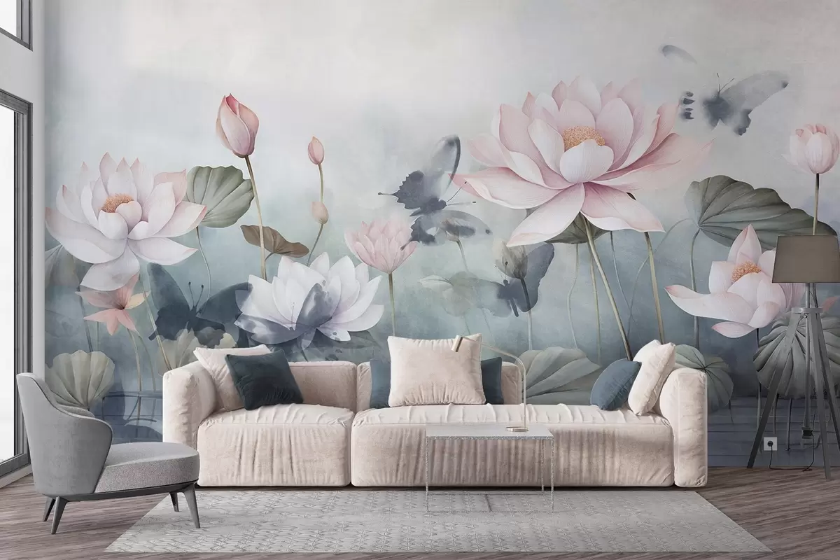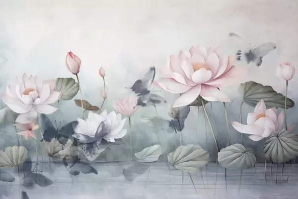 Zidne murale Cvijeće teksturirano lotosom s ružičastim pastelnim laticama, zelenim lišćem, odrazom vode, mekim pastelnim bojama, efektom akvarela br. w09254