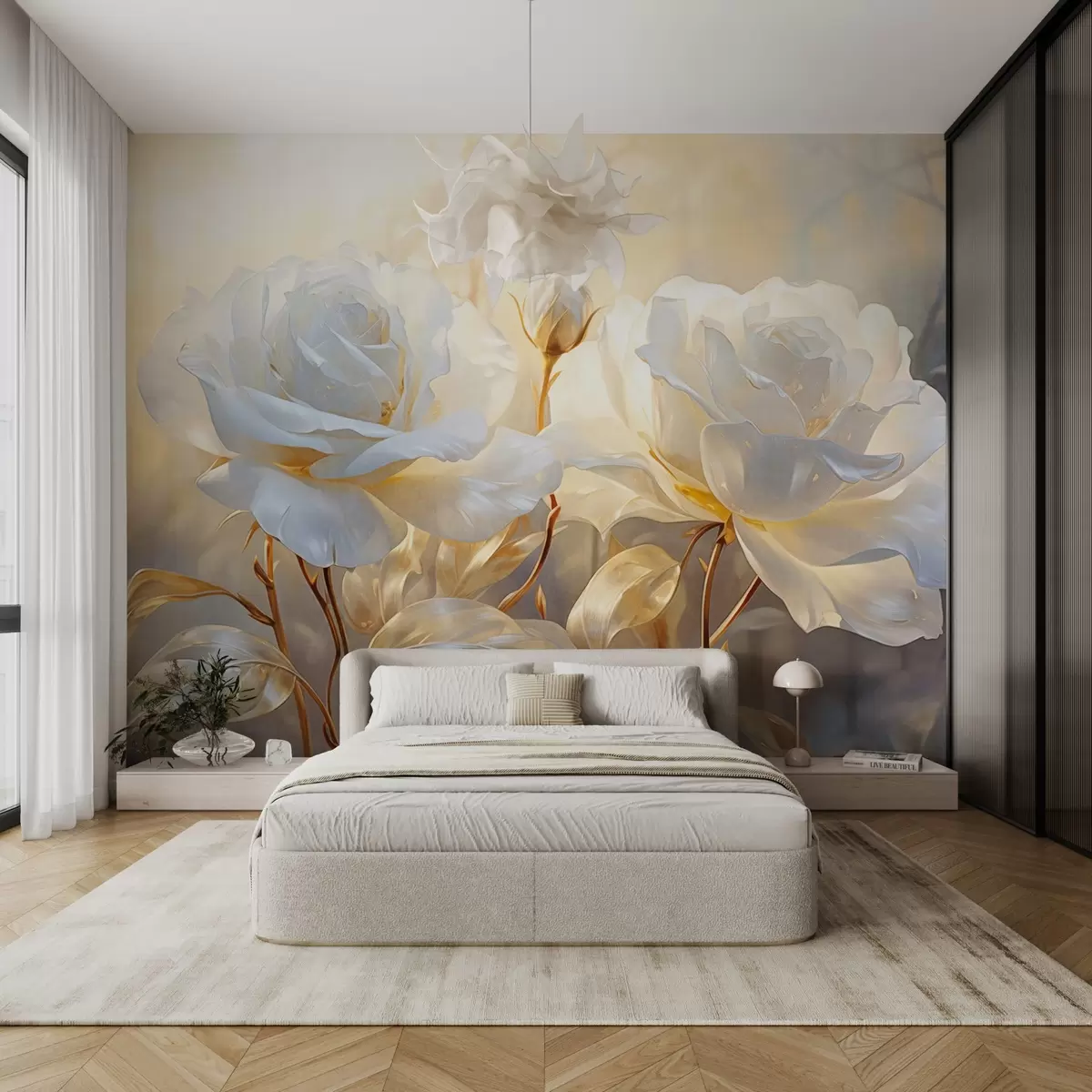 Zidne murale Bijele teksturirane ruže sa žutim stabljikama i listovima, meko osvjetljenje, svijetla pozadina s mutnim cvjetnim oblicima br. w09258
