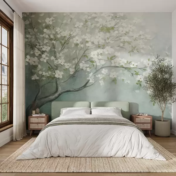 Zidne murale Stablo u cvatu s bijelim cvjetovima u punom cvatu, na zrnastoj, bučnoj teksturiranoj pozadini prigušene plave i zelene boje br. w09261