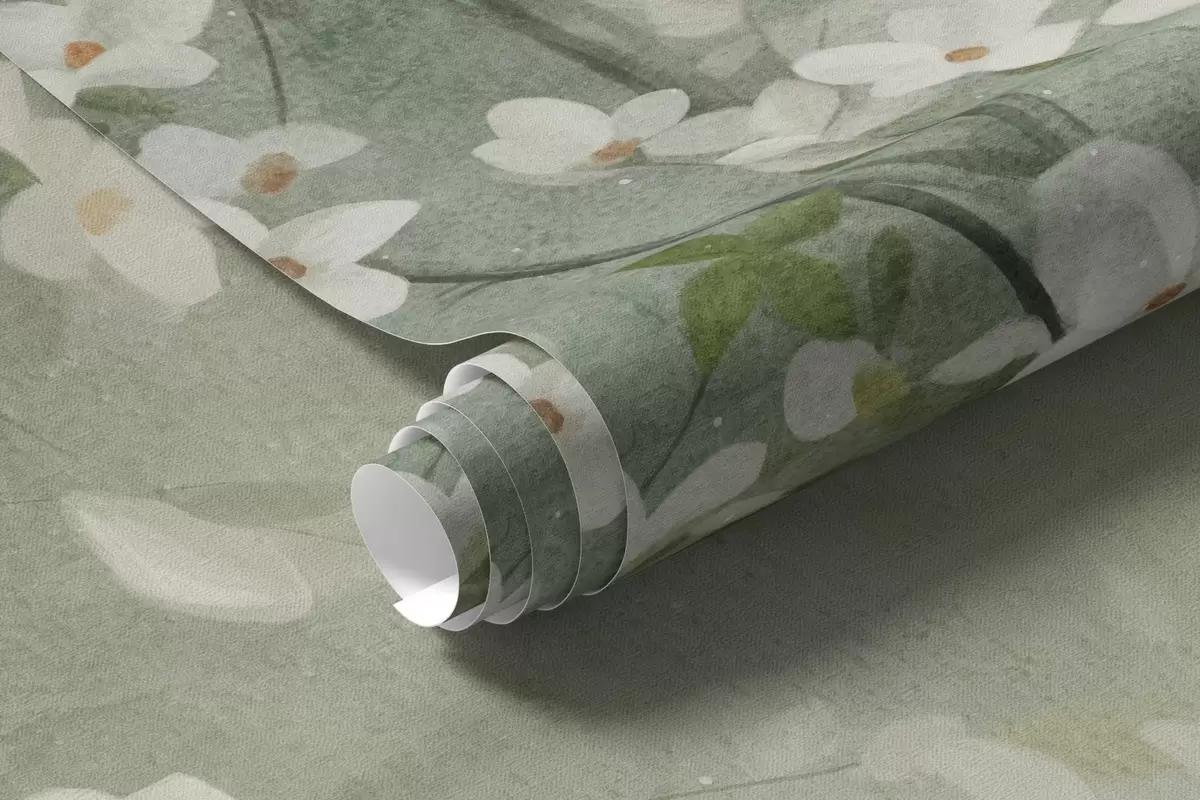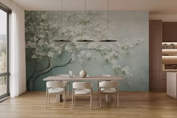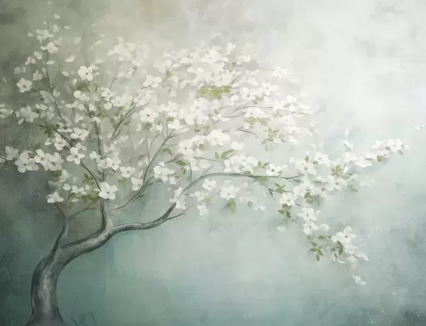 Zidne murale Stablo u cvatu s bijelim cvjetovima u punom cvatu, na zrnastoj, bučnoj teksturiranoj pozadini prigušene plave i zelene boje br. w09261