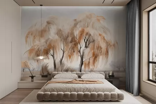 Zidne murale Teksturirane vrbe sa smeđim i bijelim lišćem na obali jezera, s malo trave oko njih, u maglovitom danu br. w09268