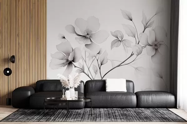 Zidne murale Crno-bijelo cvijeće s elegantnim linijama na sivoj pozadini br. w09271