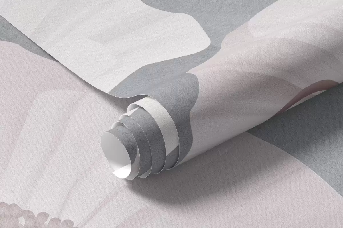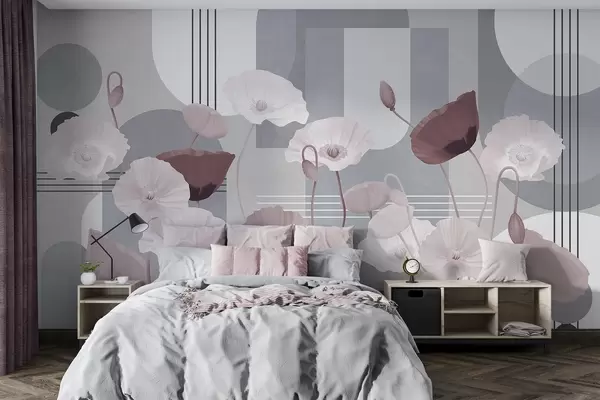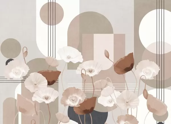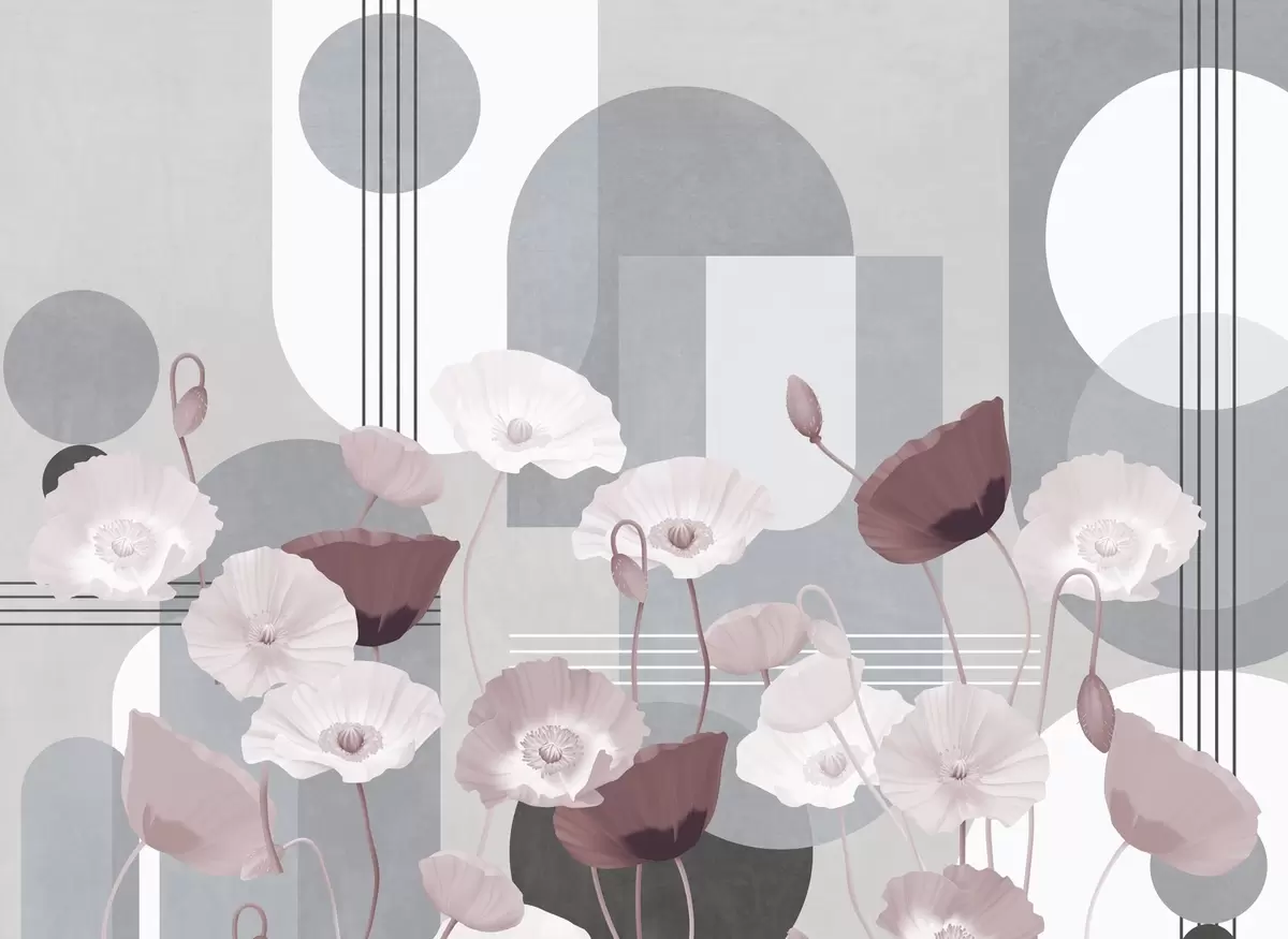 Zidne murale Makovi u bijeloj i sivoj boji s geometrijskim oblicima u pozadini, krugovima i lukovima, minimalistički stil, meke boje br. w09289v1