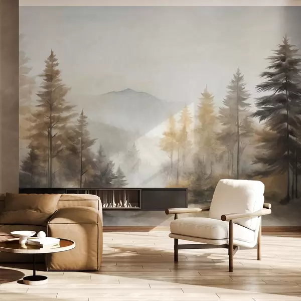 Zidne murale Teksturirana jesenska šuma s visokim borovima i planinama u pozadini, boje su prigušene i u zemljanom stilu slikanja br. w09290