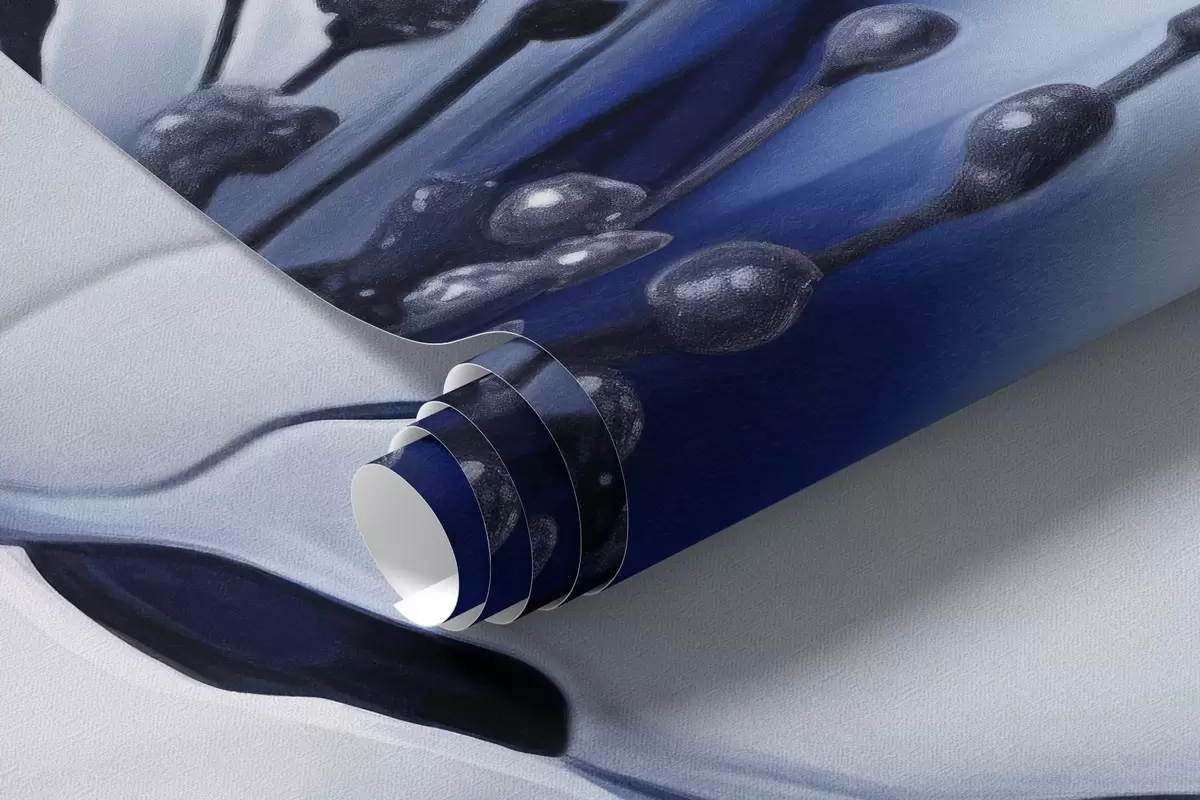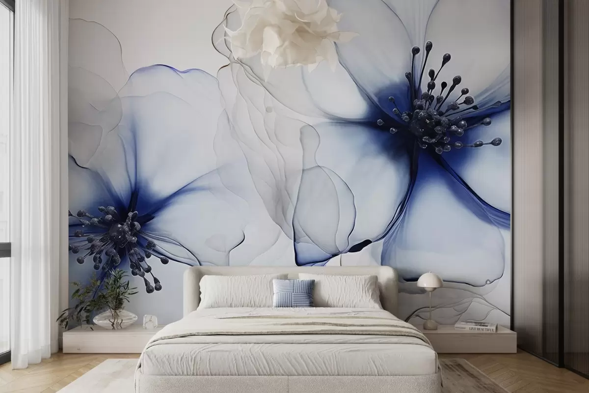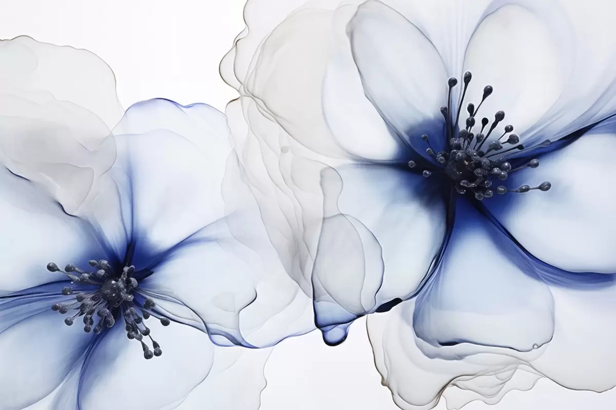 Zidne murale Dva prozirna teksturirana plava cvijeta s vidljivim prašnicima, preklapajućim nježnim laticama i mekom, tekućom teksturom br. w09295v1