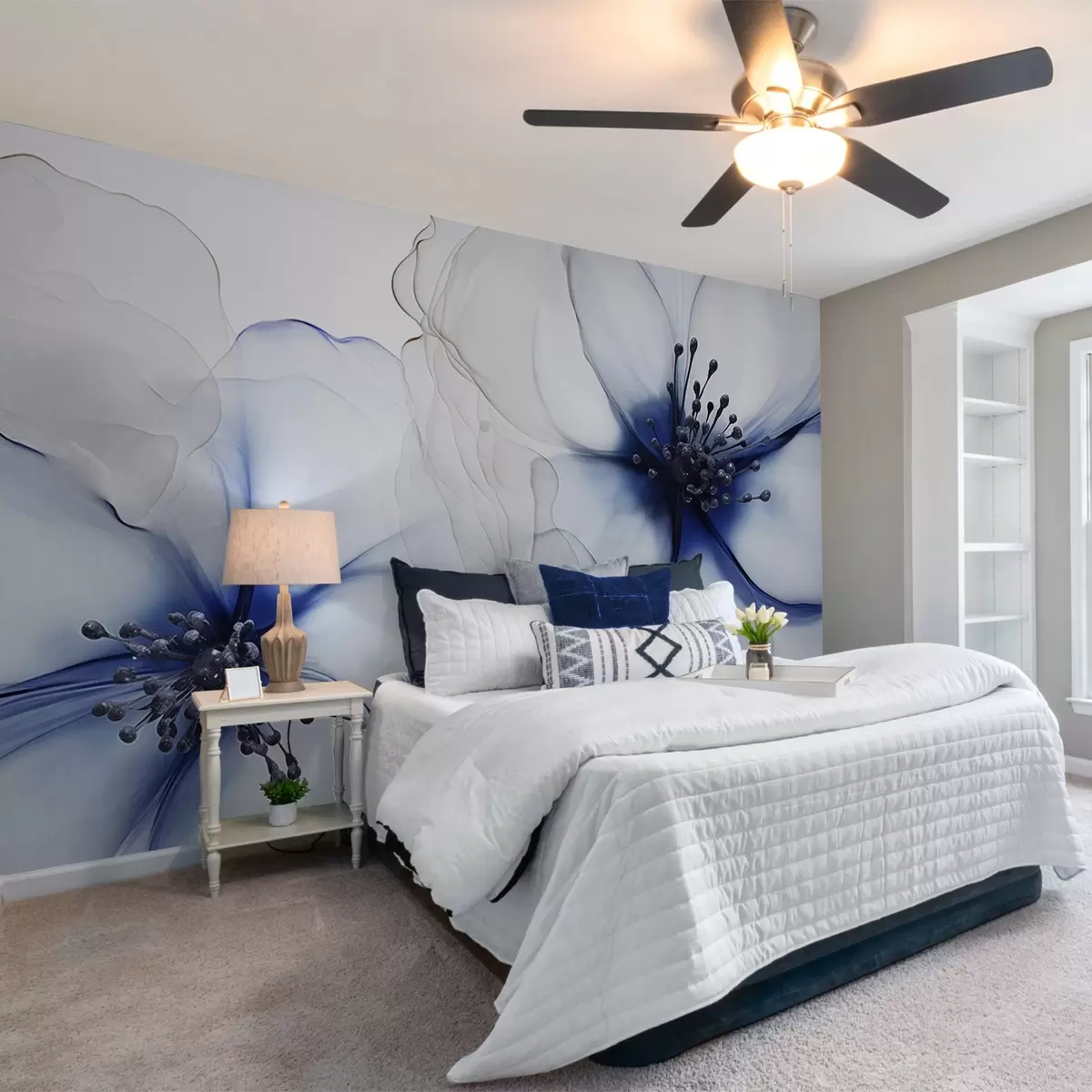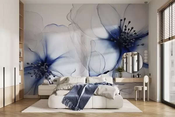Zidne murale Dva prozirna teksturirana plava cvijeta s vidljivim prašnicima, preklapajućim nježnim laticama i mekom, tekućom teksturom br. w09295v1