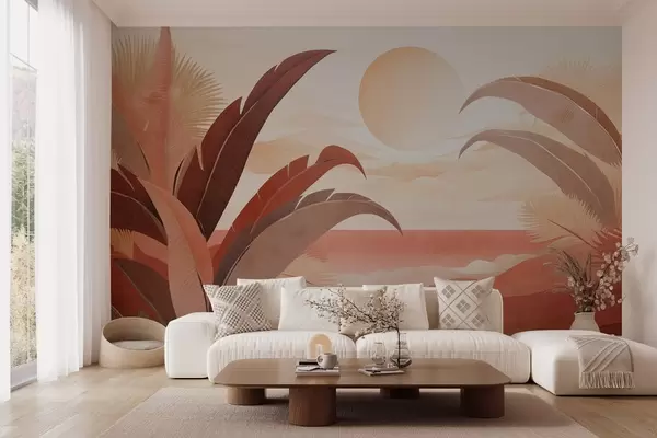 Zidne murale Tropski teksturirani apstraktni krajolik s palminim lišćem i velikim suncem na nebu, topla paleta boja, minimalistički stil, stilizirano br. w09296