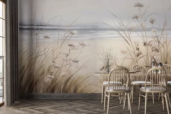 Zidne murale Polje pšenice s bijelim cvijećem u prvom planu, plaža i ocean u pozadini, neutralne pastelne prigušene boje br. w09298