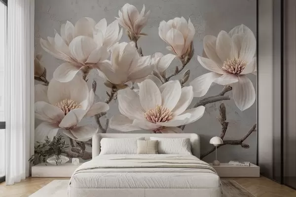 zidne murale Grane magnolije s velikim svijetlim cvjetovima u prigušenim tonovima w09305
