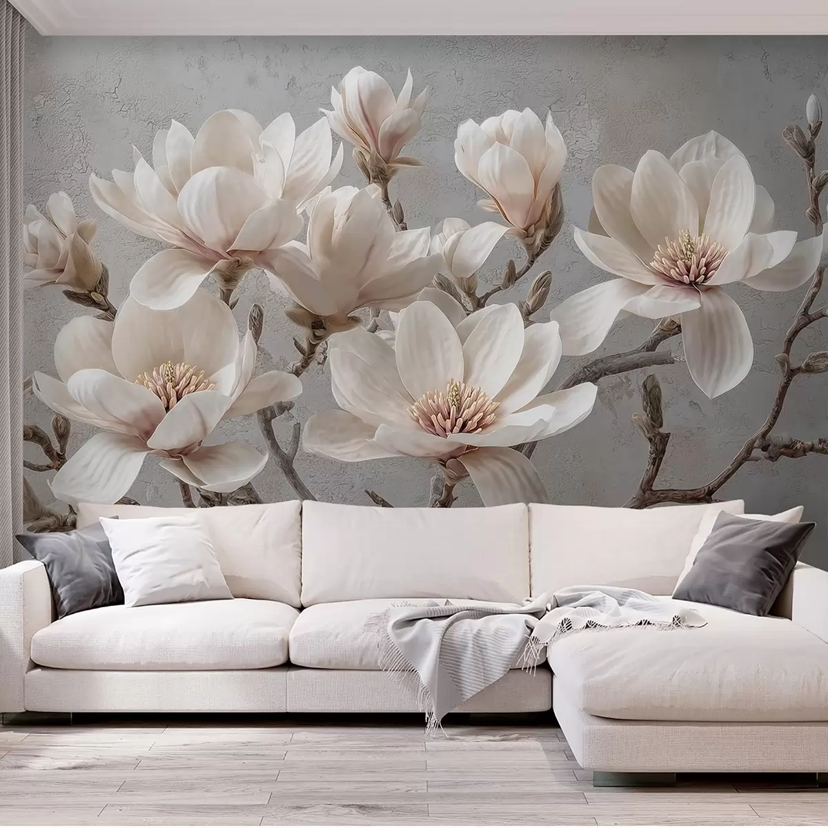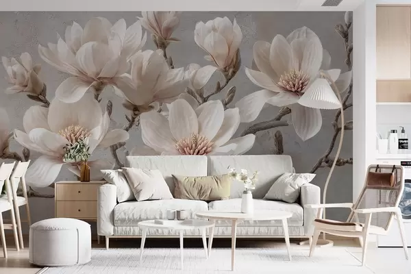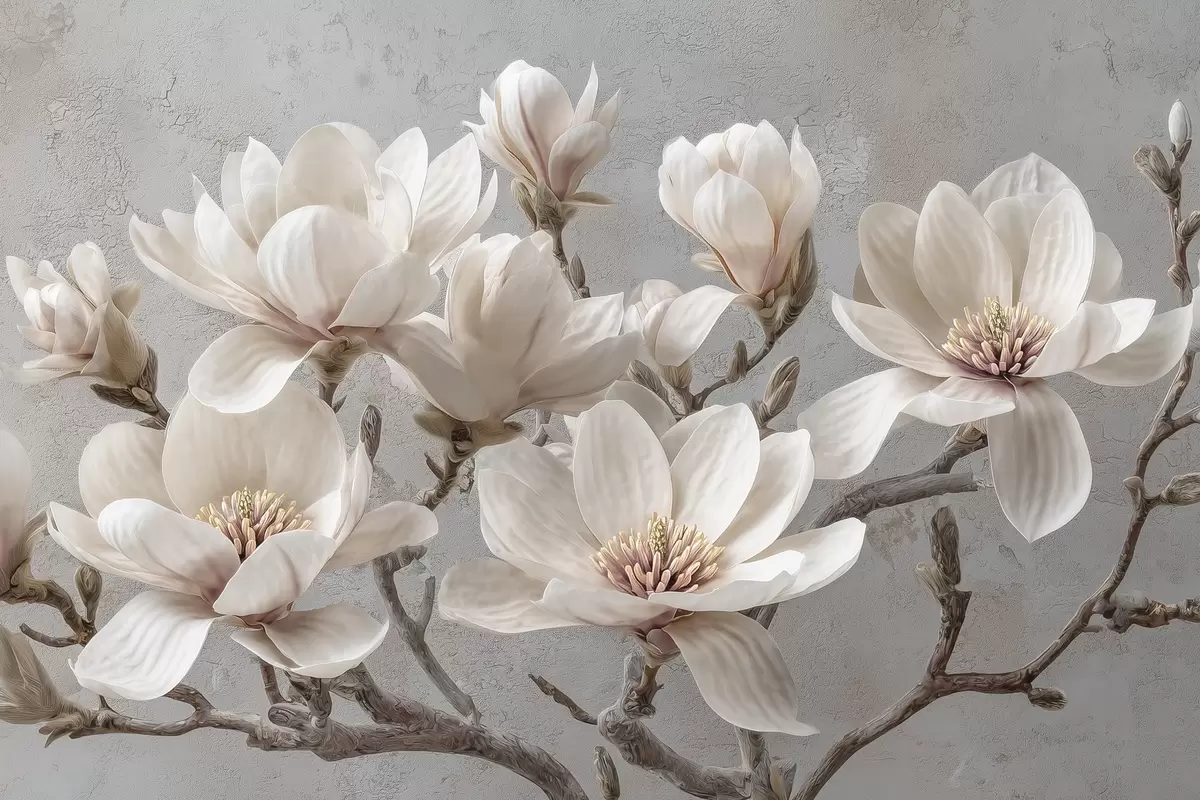 Zidne murale Grane magnolije s velikim svijetlim cvjetovima u prigušenim tonovima br. w09305