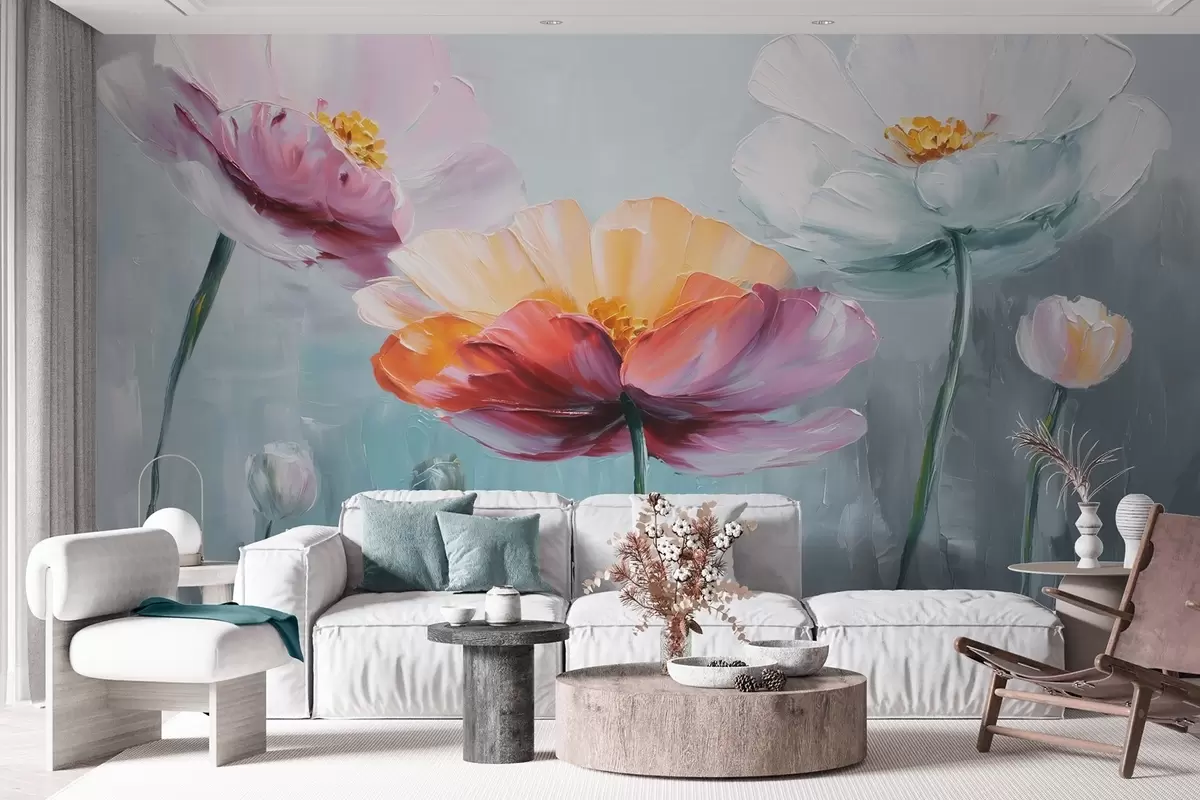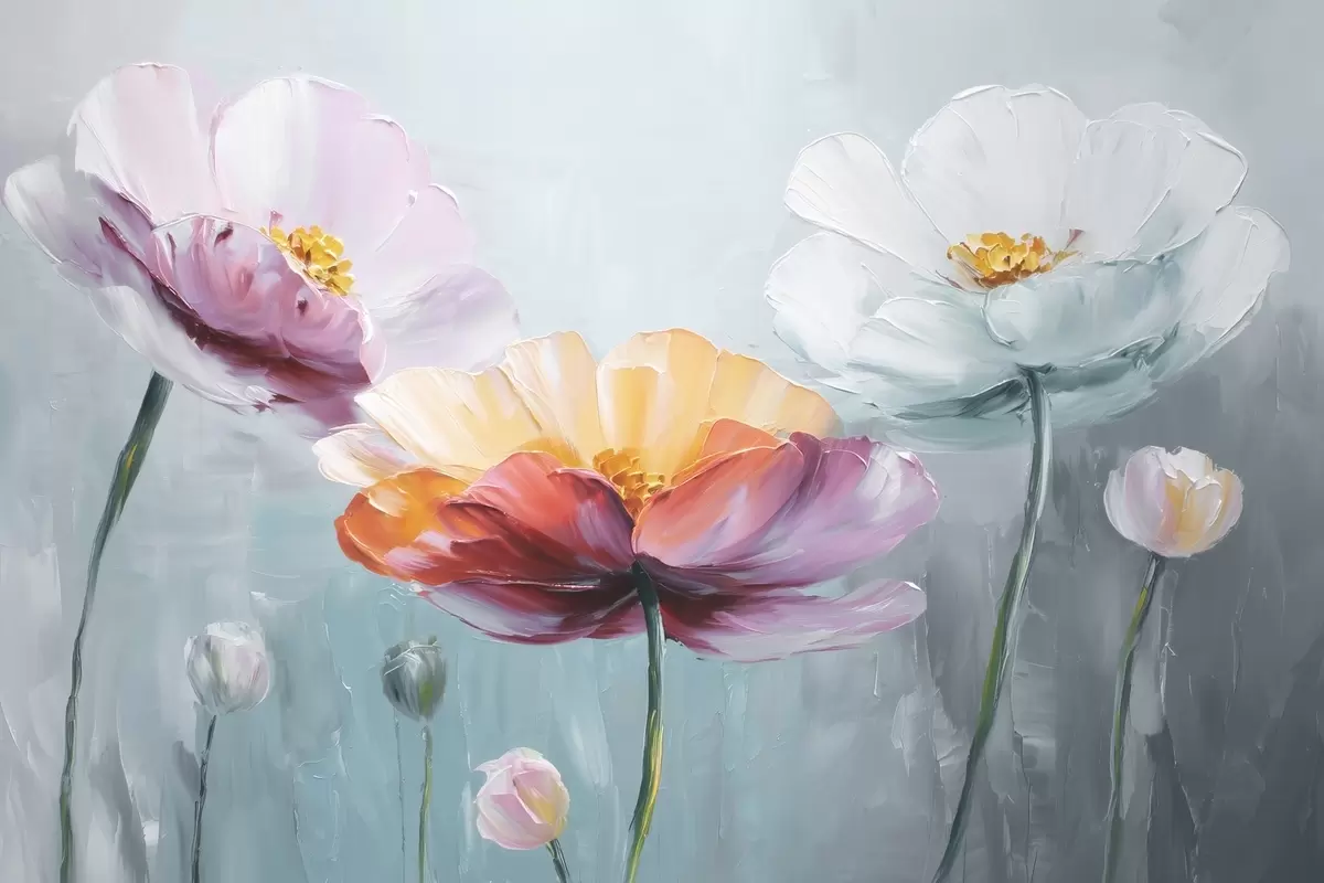 Zidne murale Svijetlo cvijeće u tehnici slikanja uljem na plavoj pozadini br. w09310