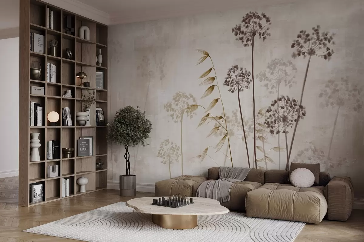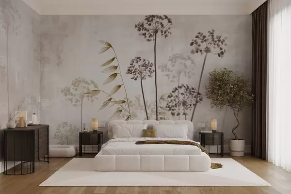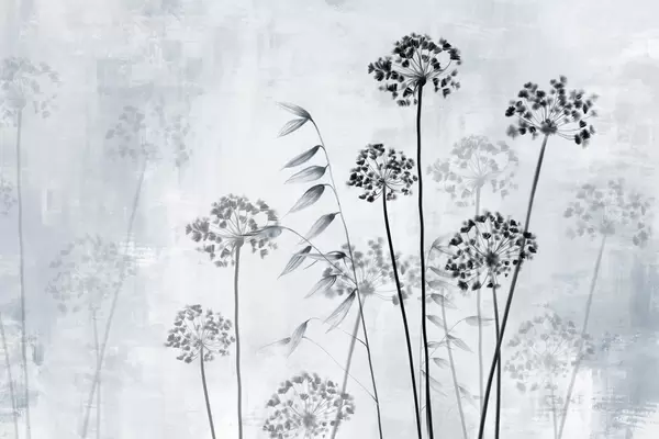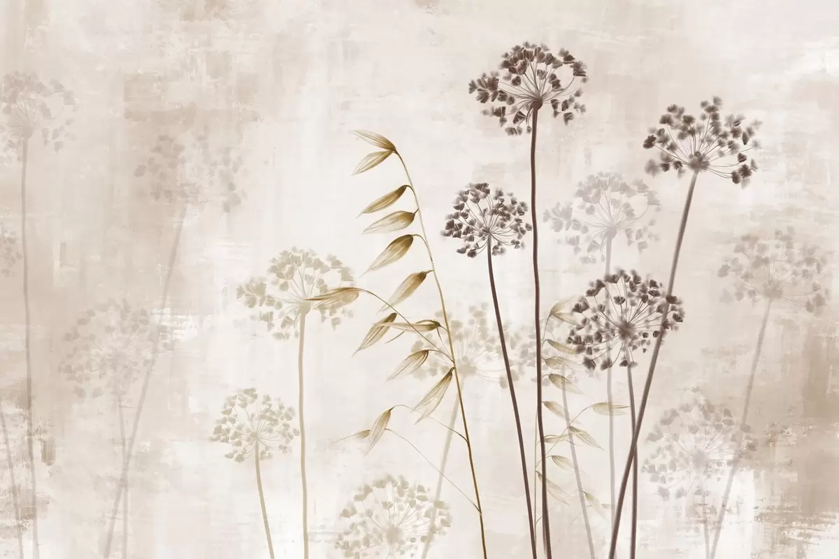 Zidne murale Crtež suhog cvijeća s dugim stabljikama, monokromatska paleta, na teksturiranoj, svijetlo bež pozadini, botanička ilustracija br. w09314v1
