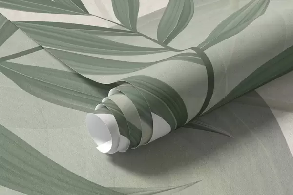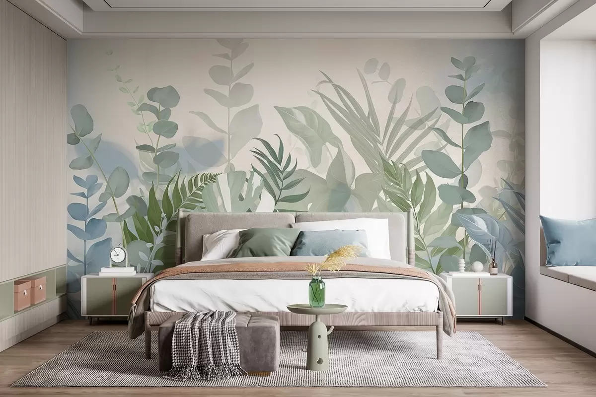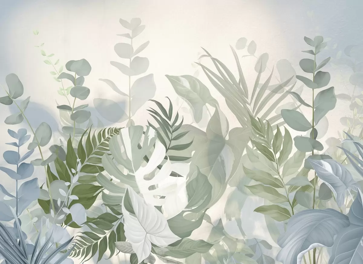 Zidne murale Pastelno zelene biljke paprati, monstera i eukaliptus, svijetla teksturirana pozadina, meko osvjetljenje, mirno, botanička ilustracija br. w09316