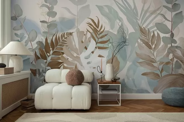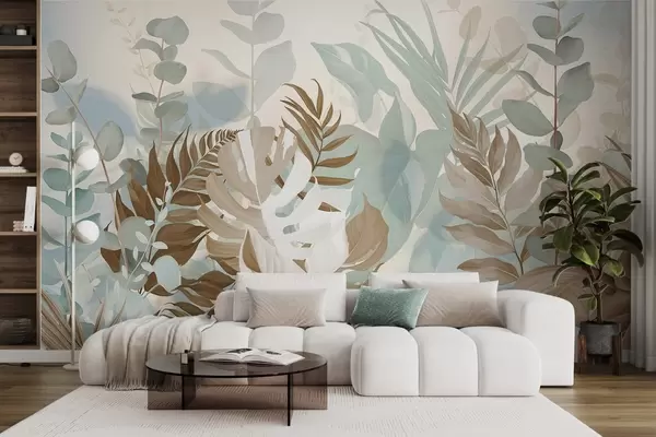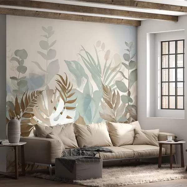 zidne murale Pastelne biljke paprati, monstera i eukaliptus, svijetla teksturirana pozadina, meko osvjetljenje, mirno, botanička ilustracija w09316v1