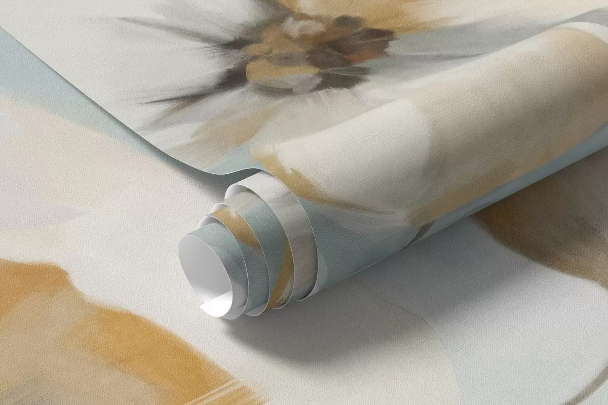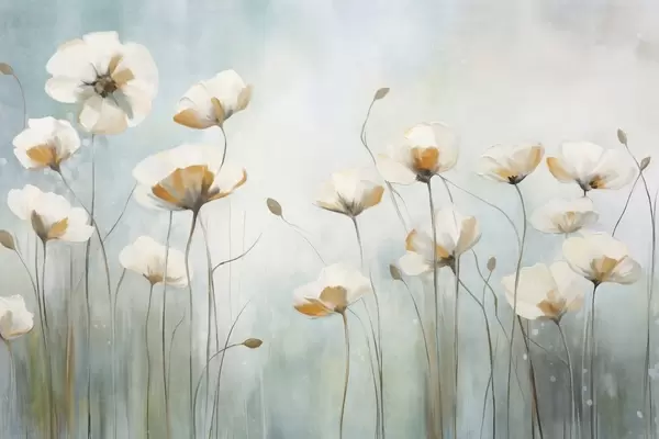 Zidne murale Bijeli teksturirani makovi na dugim stabljikama, svijetloplava i zelena pozadina, meki potezi kistom, nježan cvjetni aranžman polja br. w09317