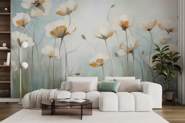 Zidne murale Bijeli teksturirani makovi na dugim stabljikama, svijetloplava i zelena pozadina, meki potezi kistom, nježan cvjetni aranžman polja br. w09317