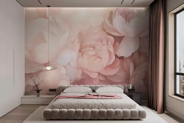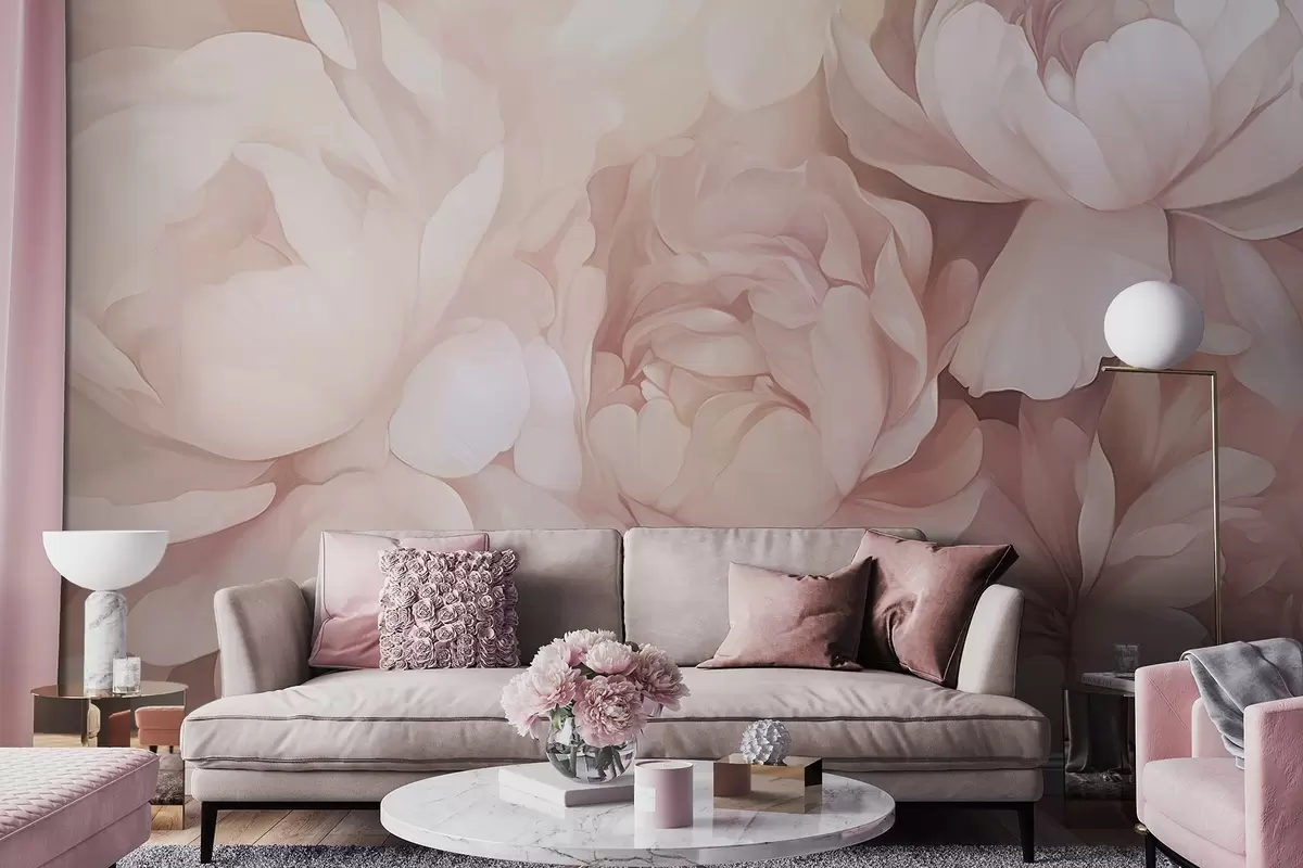 Zidne murale Svijetlo pastelno ružičasti božuri s mekim, teksturiranim, nježnim laticama, gusto raspoređeni, stvarajući gustu cvjetnu umjetnost, meko osvjetljenje br. w09319