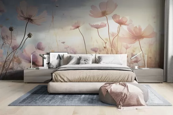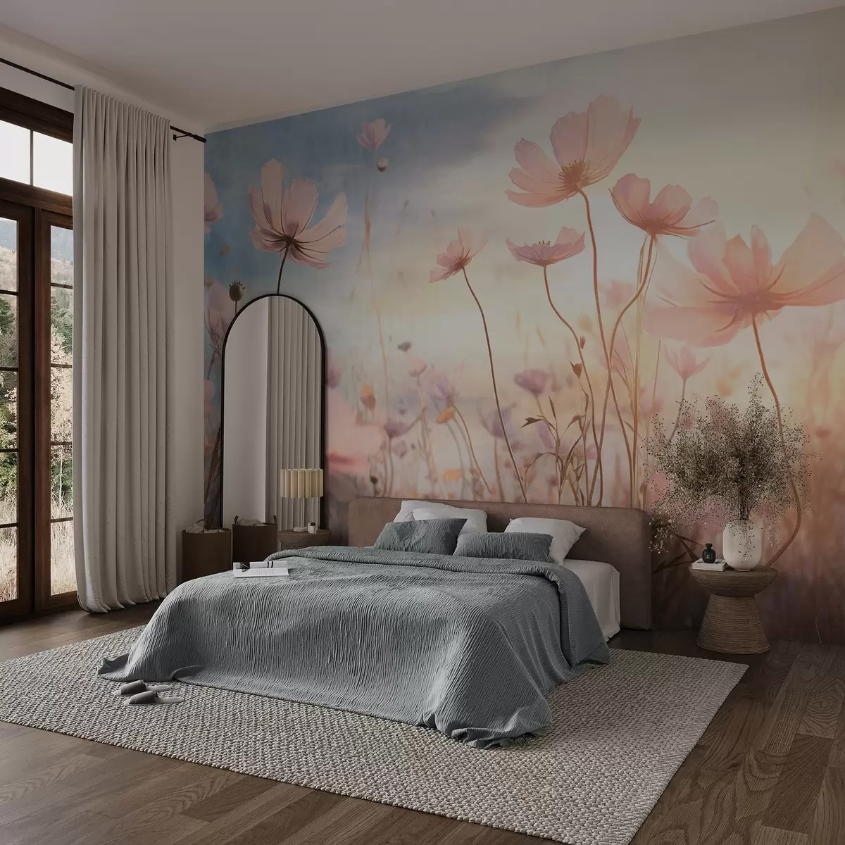 Zidne murale Polje ružičastog teksturiranog cvijeća s dugim stabljikama, uz meko plavo i žuto nebo, stvara sanjivu atmosferu br. w09320
