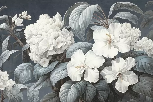 Zidne murale Bijelo tropsko cvijeće s nježnim laticama i lišćem u tamnoplavoj pozadini, vintage teksturirani stil, botanička ilustracija br. w09334