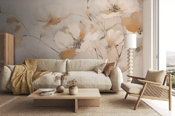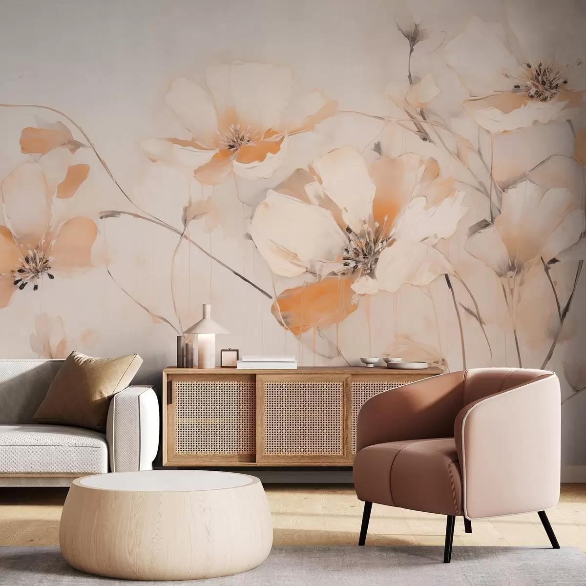 Zidne murale Bijelo i narančasto teksturirano cvijeće s dugim stabljikama, svijetla pozadina, meke boje, elegantna kompozicija, nježni potezi kistom br. w09335