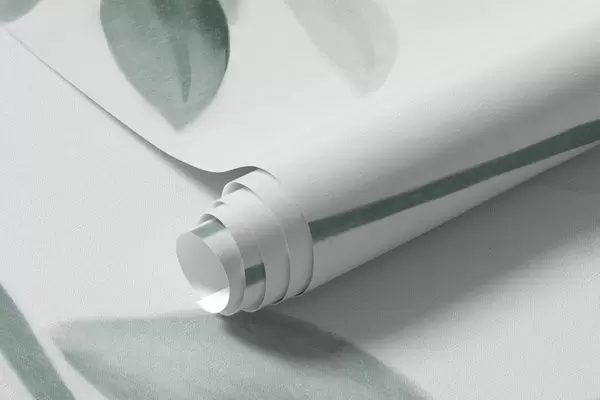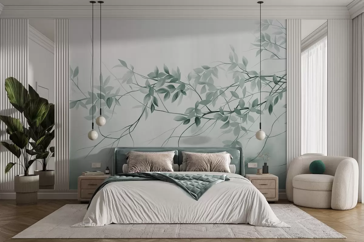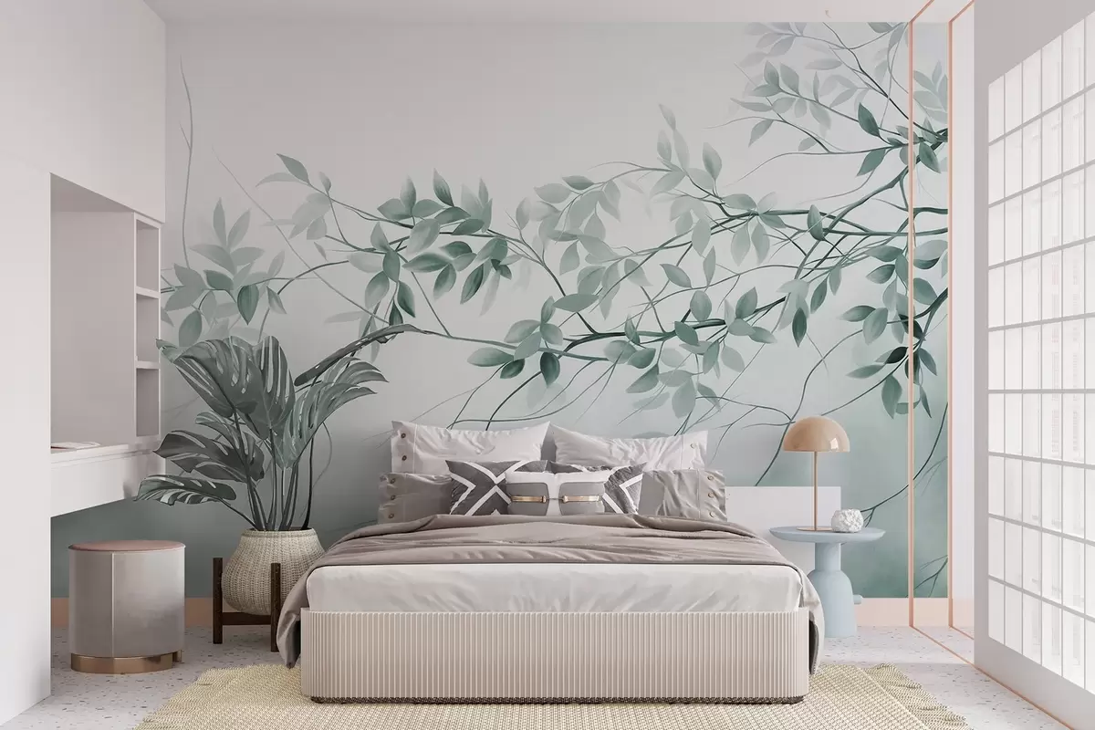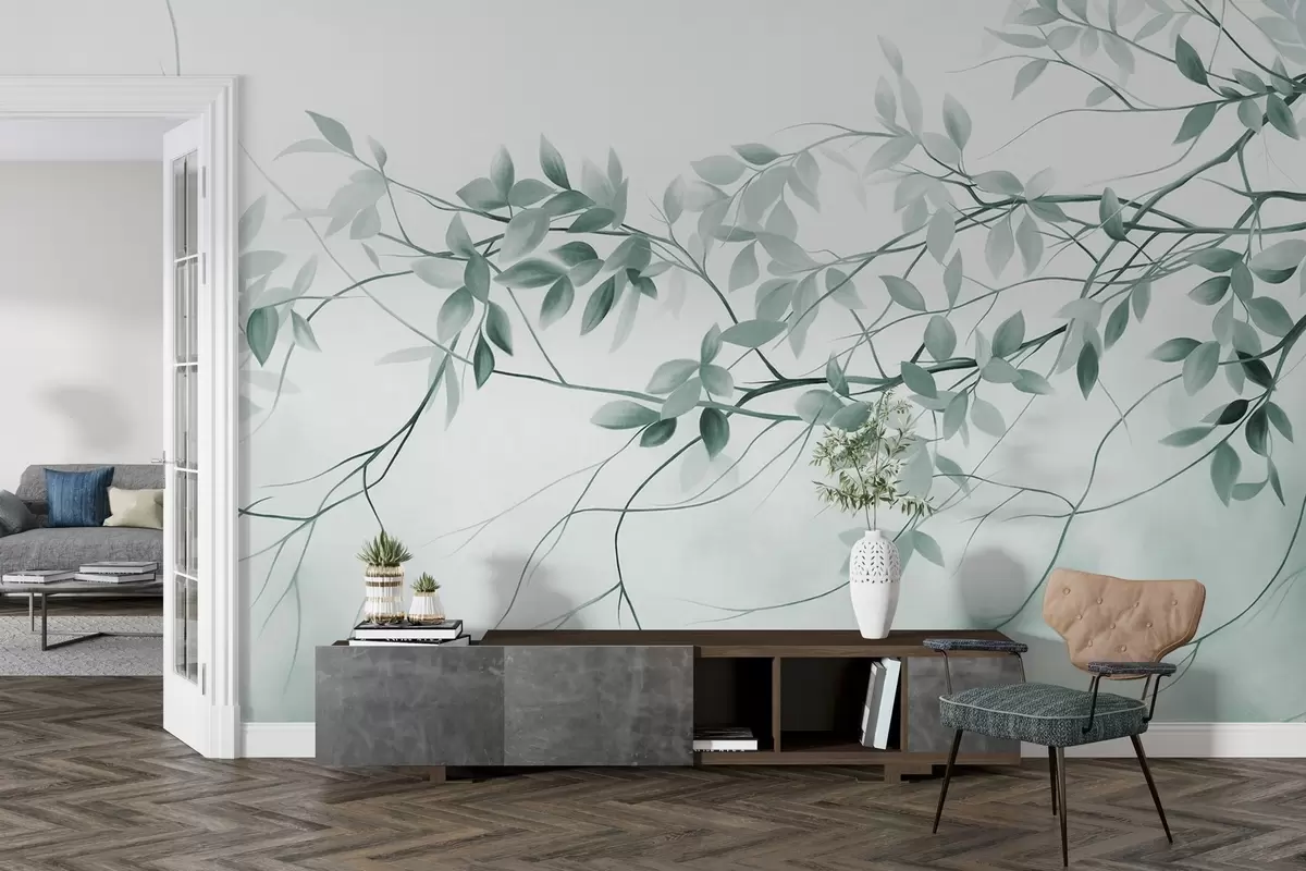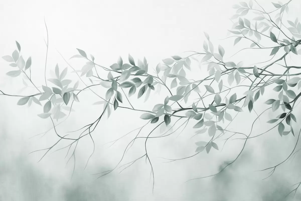 Zidne murale Nježne teksturirane grane s prigušenim sivim i zelenim lišćem na mekoj, zamućenoj pozadini br. w09336v1