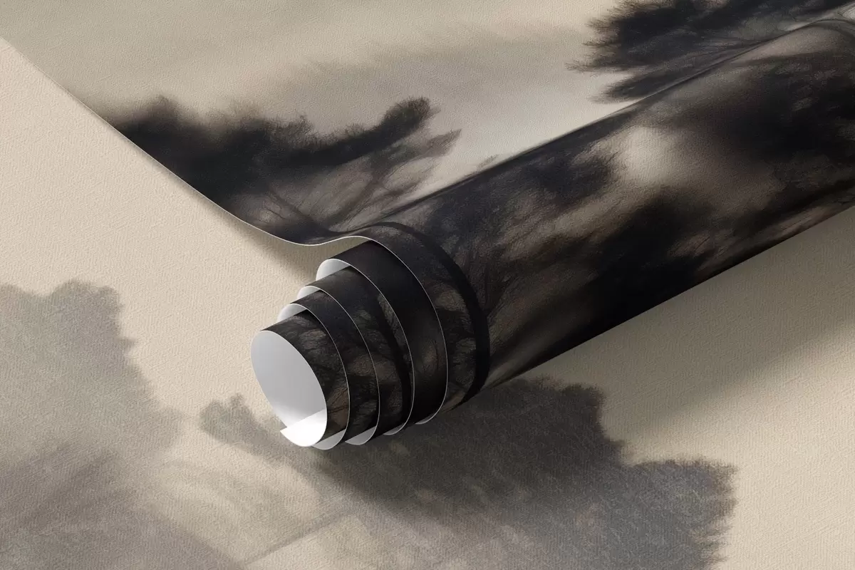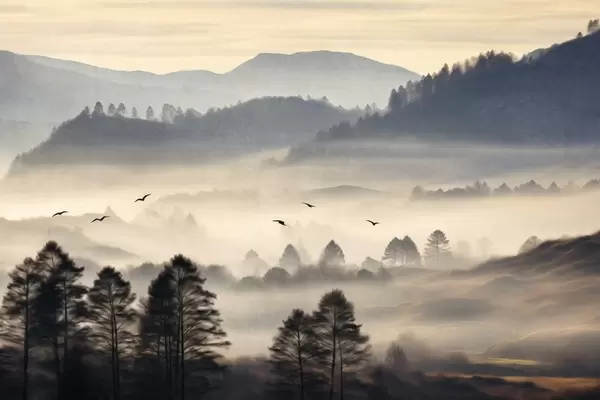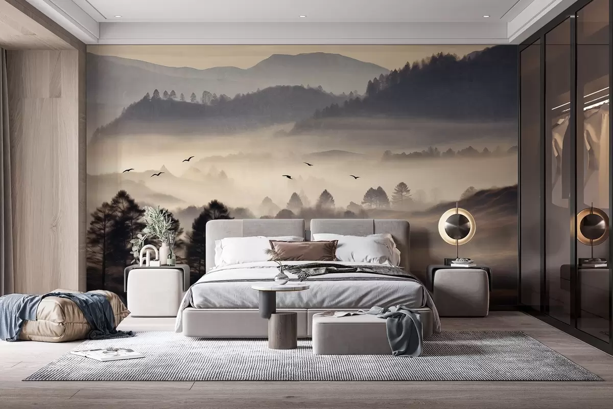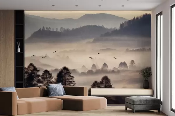 Zidne murale Teksturirani planinski krajolik sa slojevima magle, siluetama drveća u prvom planu, udaljenim planinskim lancem, mekim osvjetljenjem br. w09338
