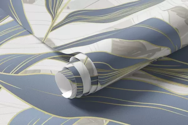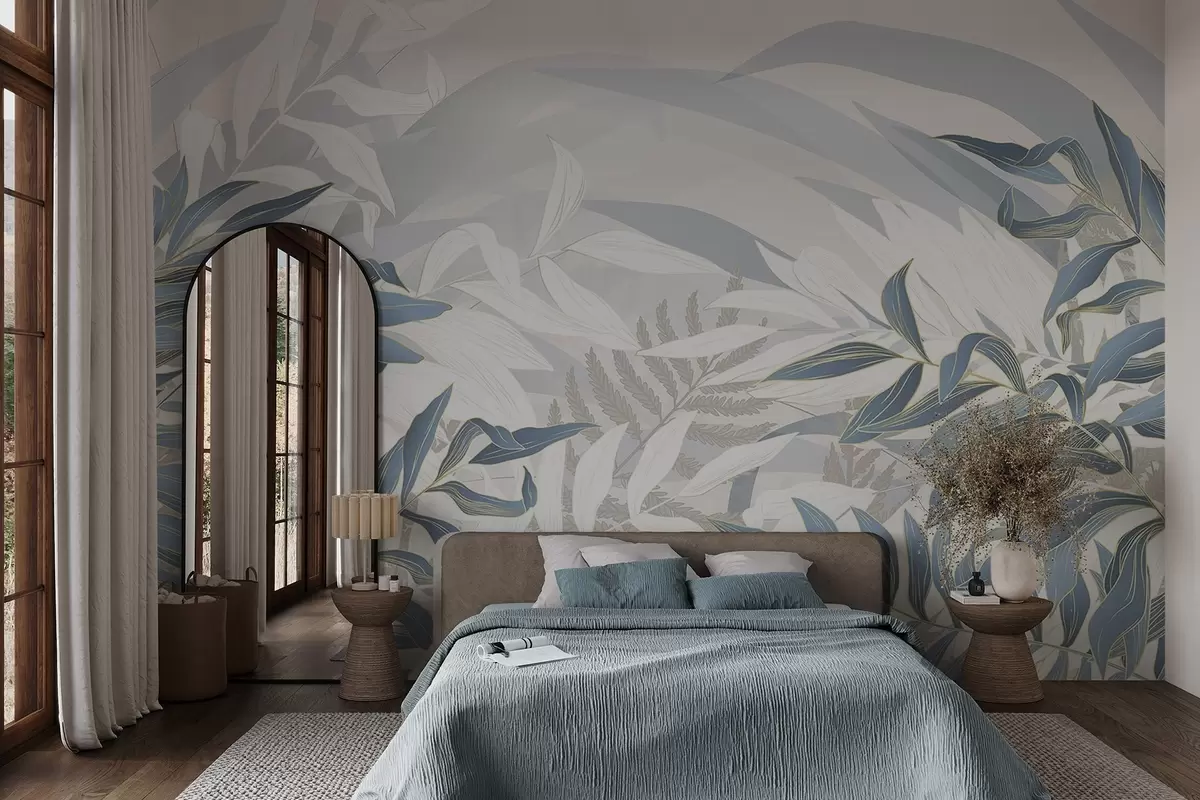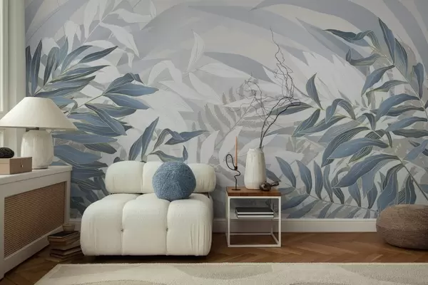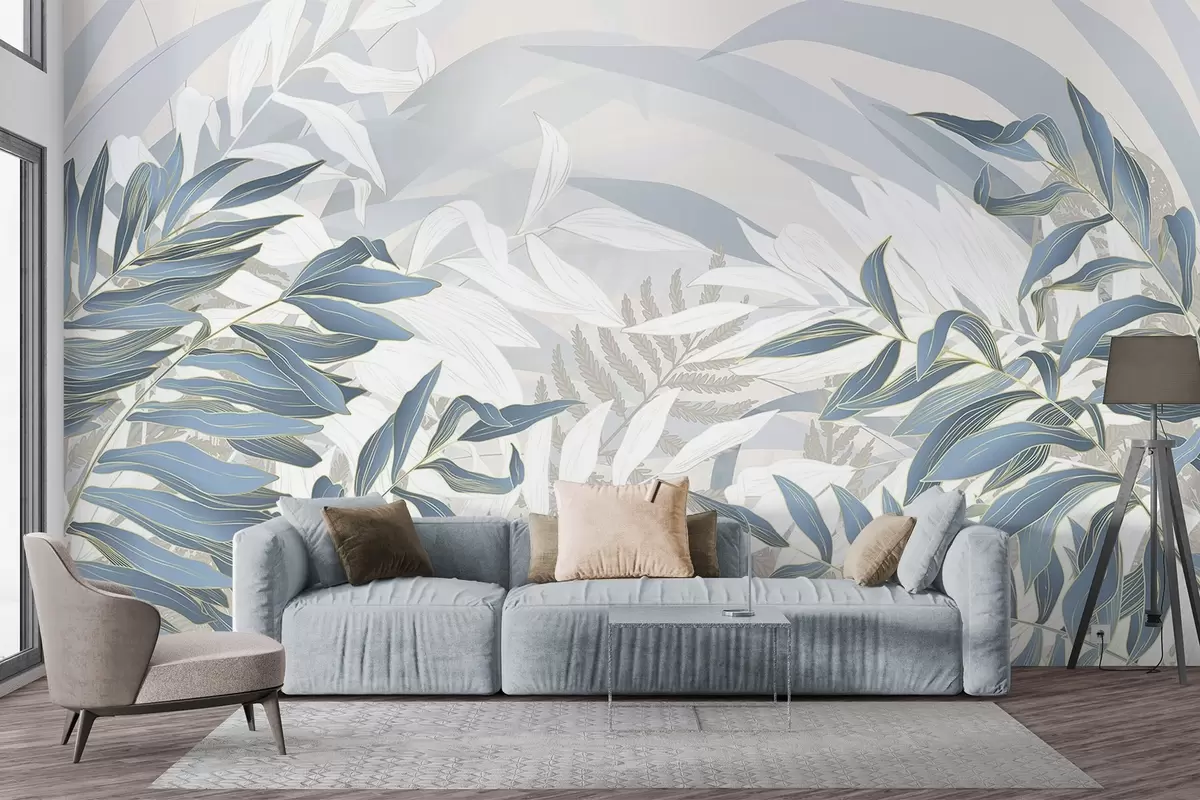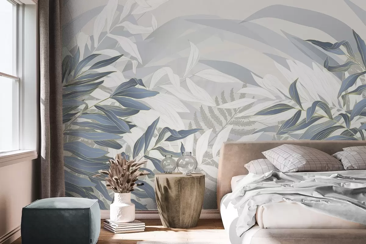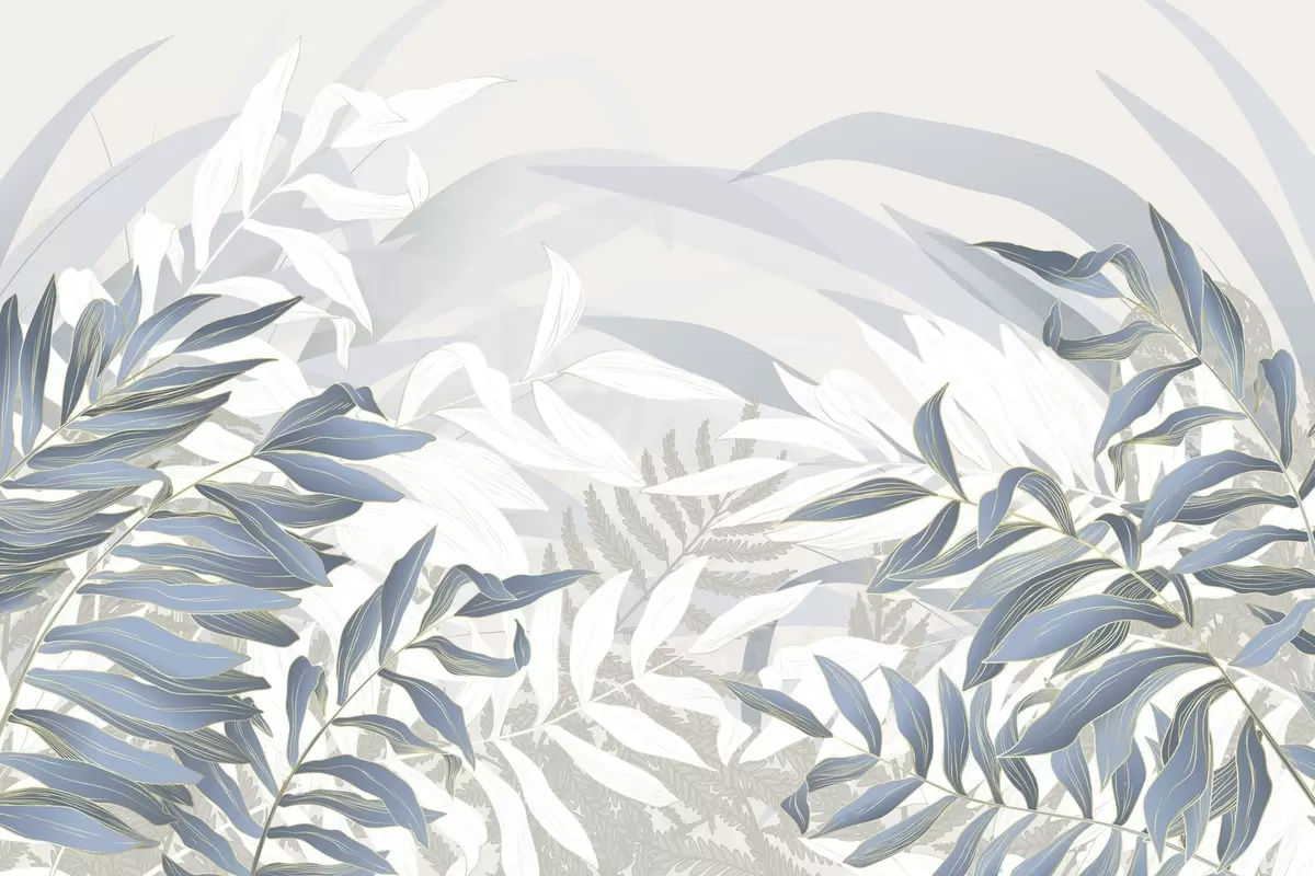 Zidne murale Plavo i bijelo lišće i trava, meke pastelne boje, botanička ilustracija, minimalistički dizajn, dekorativno, moderno br. w09341