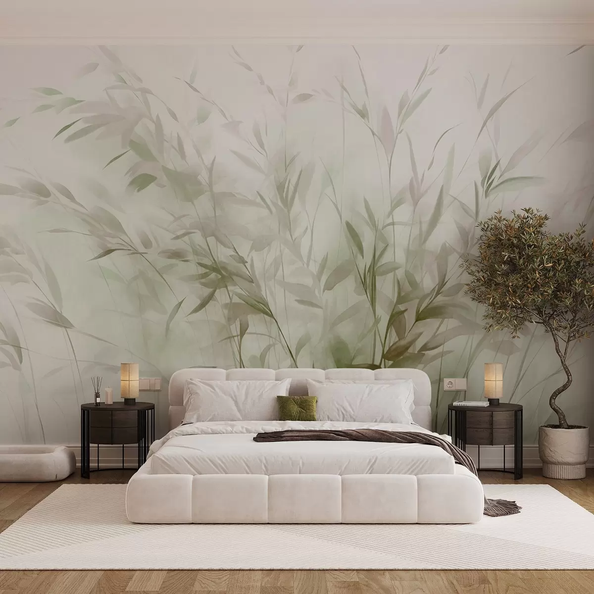 Zidne murale Trava i korov s tankim lišćem i stabljikama, svijetlozelene i smeđe boje, meki i nježni potezi kistom, minimalistički print br. w09342