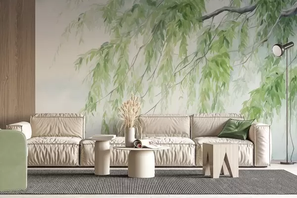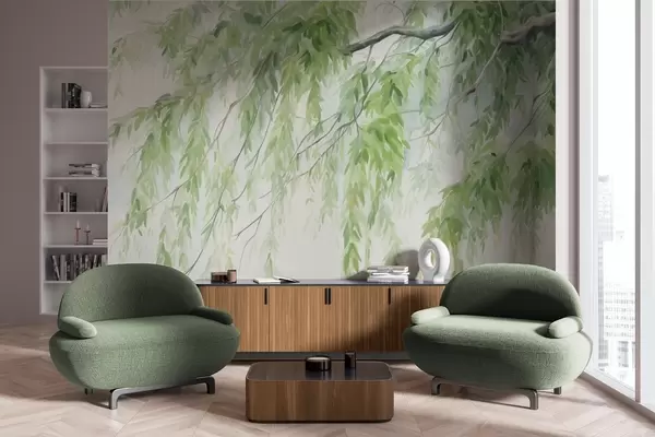 Zidne murale Grane plačuće vrbe s visećim zelenim lišćem, meki i nježni potezi kistom, stil slikanja akvarelom br. w09365