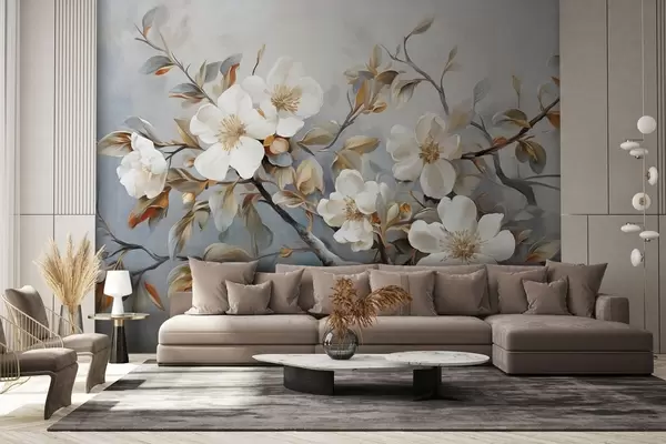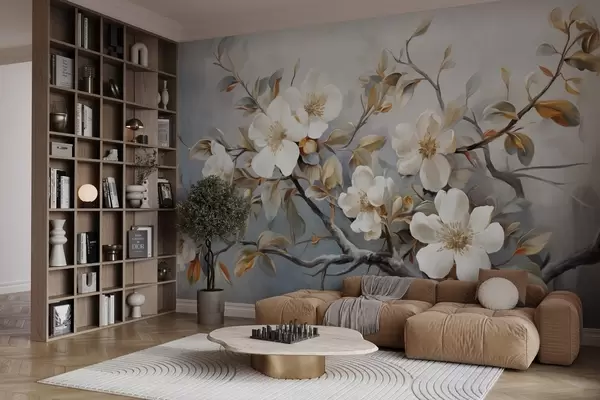 zidne murale Bijelo cvijeće sa žutim tučkovima na grani drveta s lišćem, svijetla pozadina, vintage stil slikanja, teksturirani otisak w09368