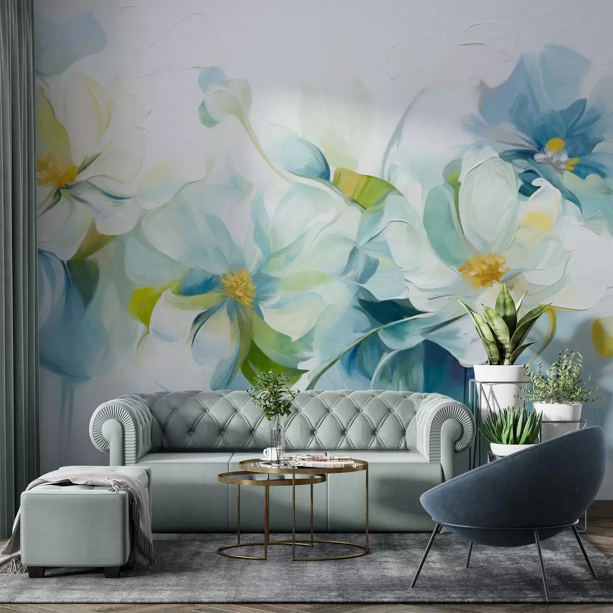 Zidne murale Apstraktno bijelo i plavo cvijeće sa žutim tučkovima i zelenim lišćem, na bijeloj pozadini, teksturirani stil slikanja br. w09372