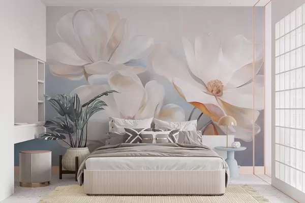 Zidne murale Bijeli fantastični cvjetovi magnolije s nježnim teksturiranim laticama, mekana, apstraktna pozadina br. w09373