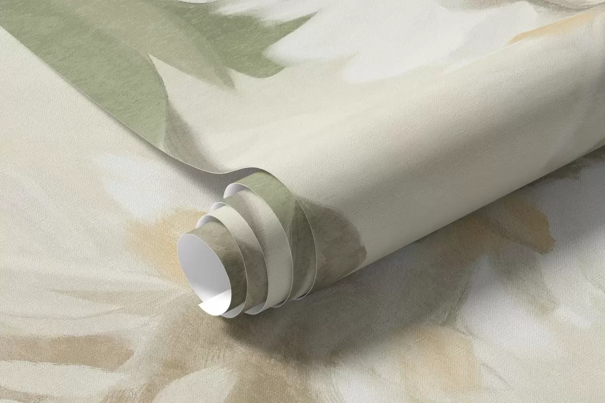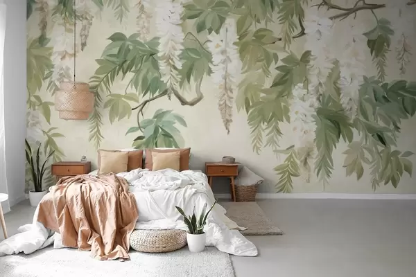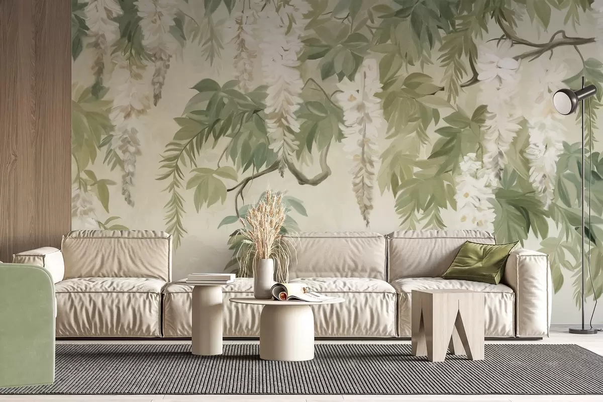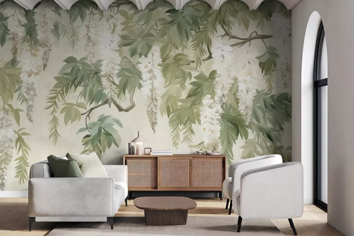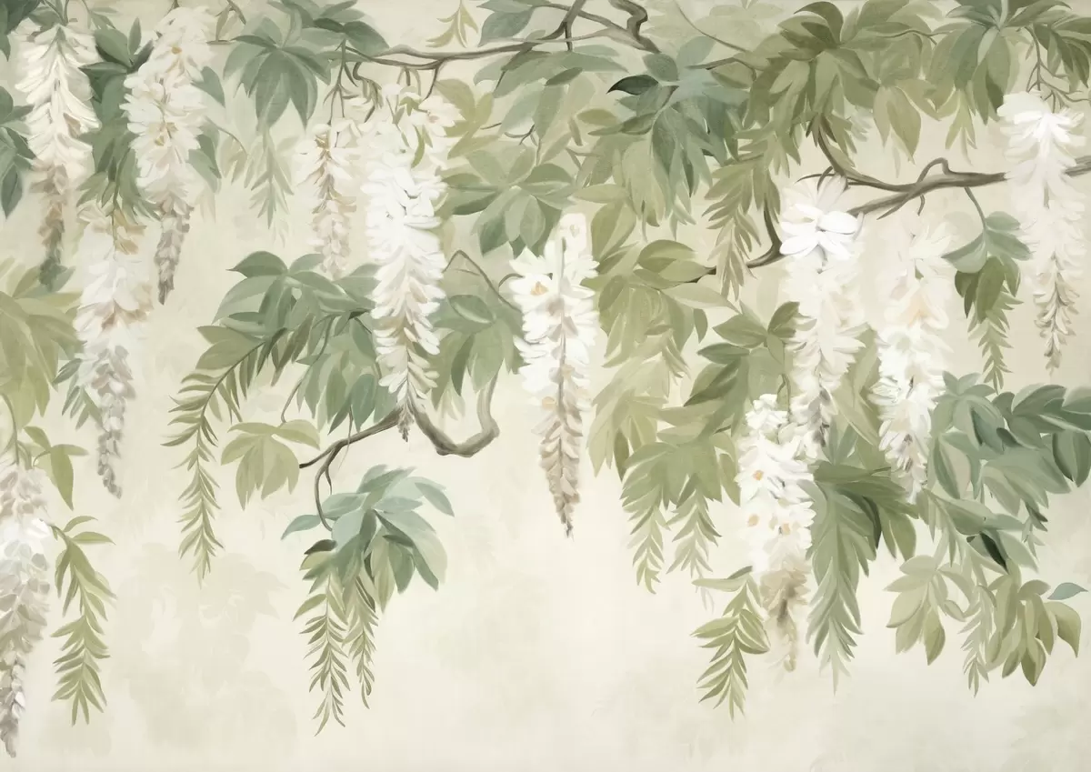 Zidne murale Grane glicinije s bijelim cvjetovima i zelenim lišćem, zelena pozadina, teksturirani vintage stil slikanja br. w09375