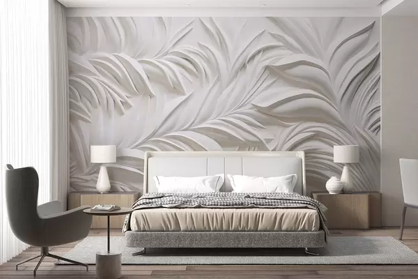 zidne murale Apstraktno teksturirano bijelo lišće i cvjetni elementi, minimalistička estetika w09378