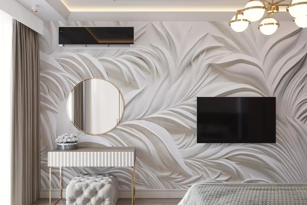 Zidne murale Apstraktno teksturirano bijelo lišće i cvjetni elementi, minimalistička estetika br. w09378
