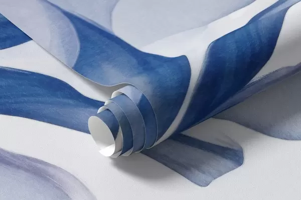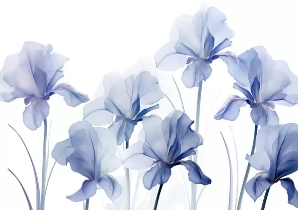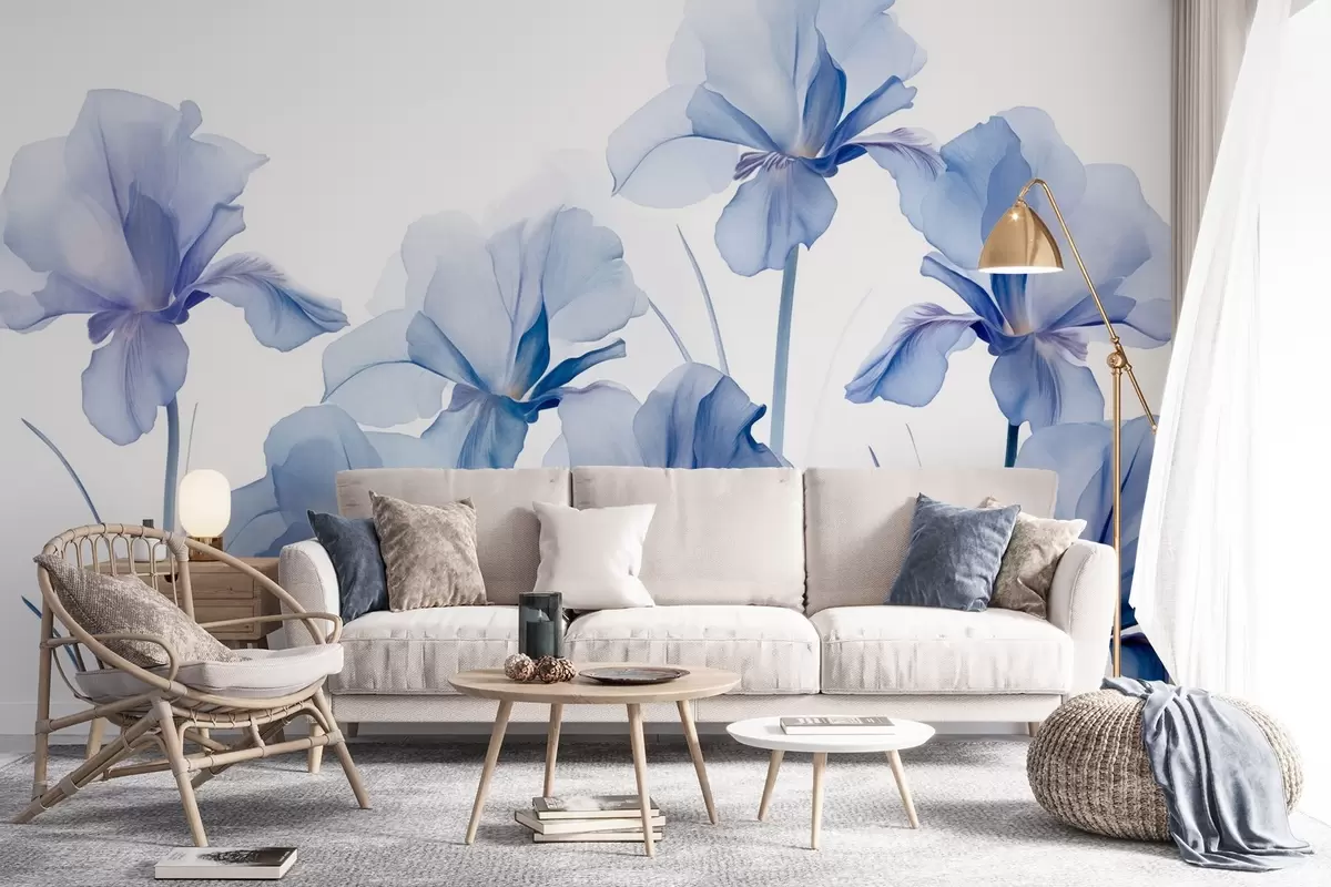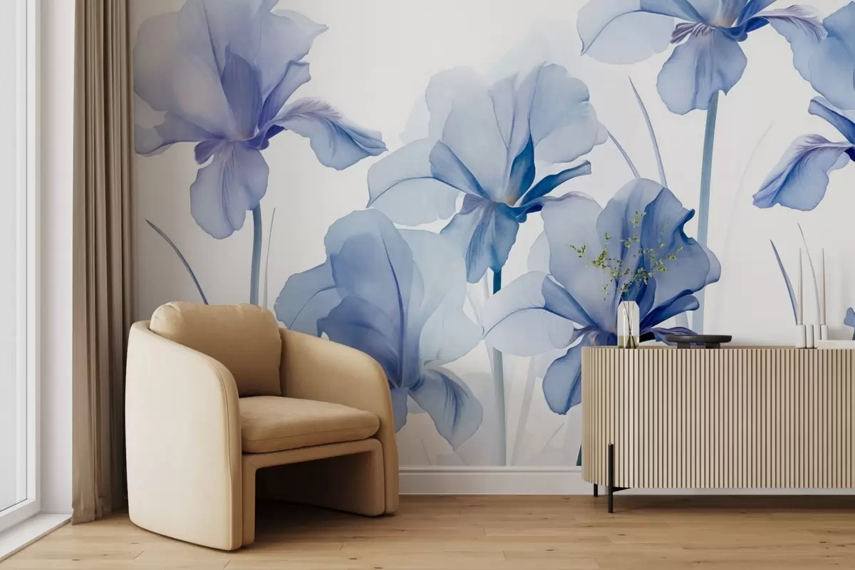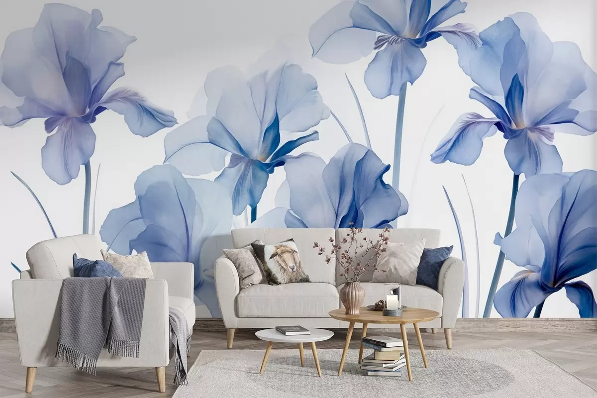 Zidne murale Plavi cvjetovi perunike s prozirnim laticama i dugim stabljikama, poredani u nizu na plavoj pozadini, mekani i teksturirani br. w09379
