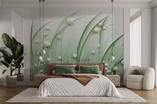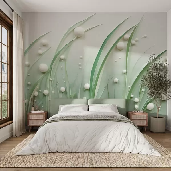 Zidne murale Apstraktna zelena trava s bijelim kuglama, svijetlozelena pozadina, tekstura, čiste linije, minimalistički stil br. w09382